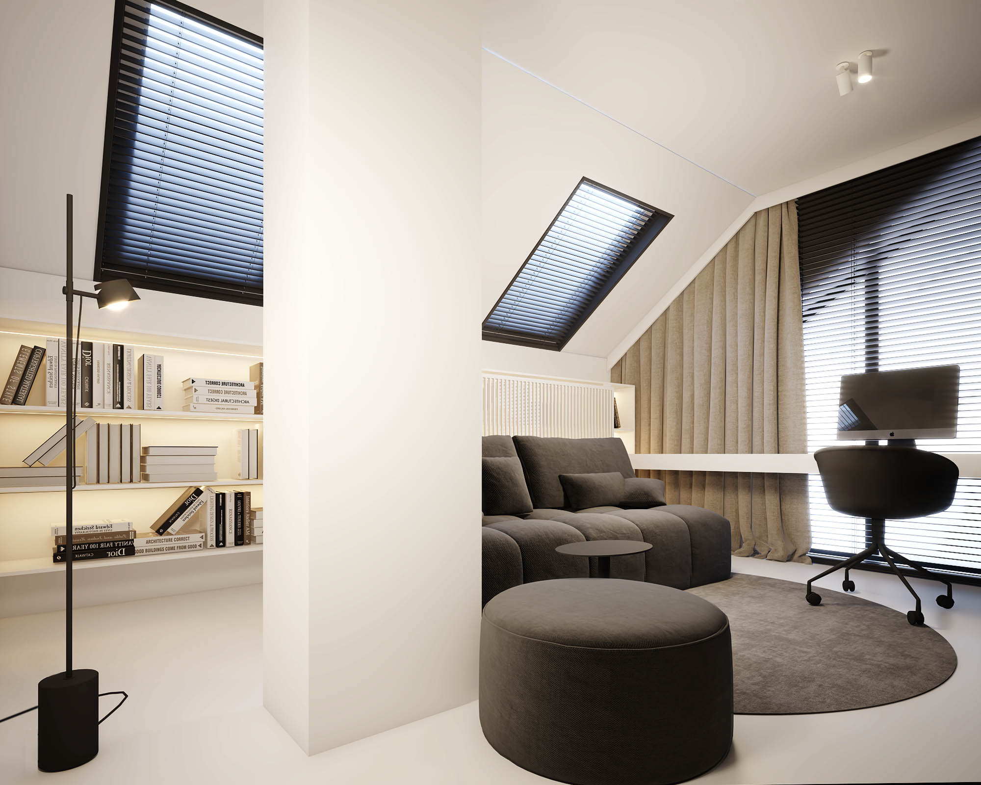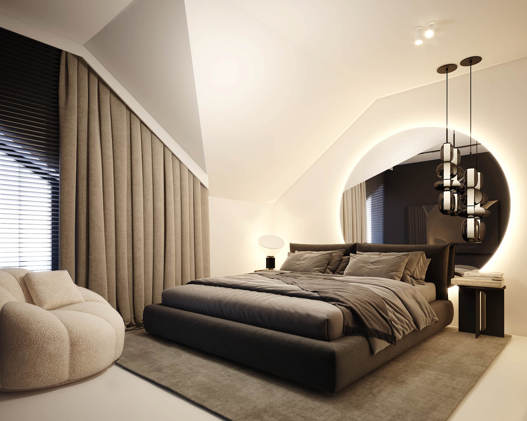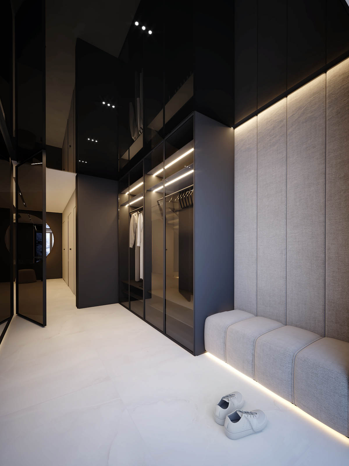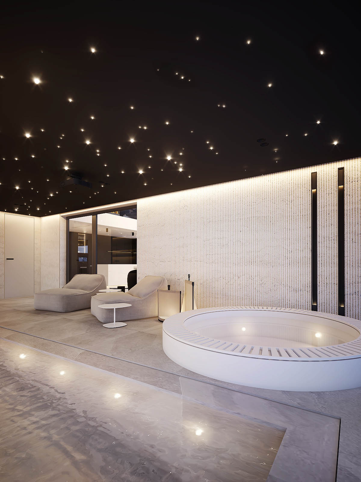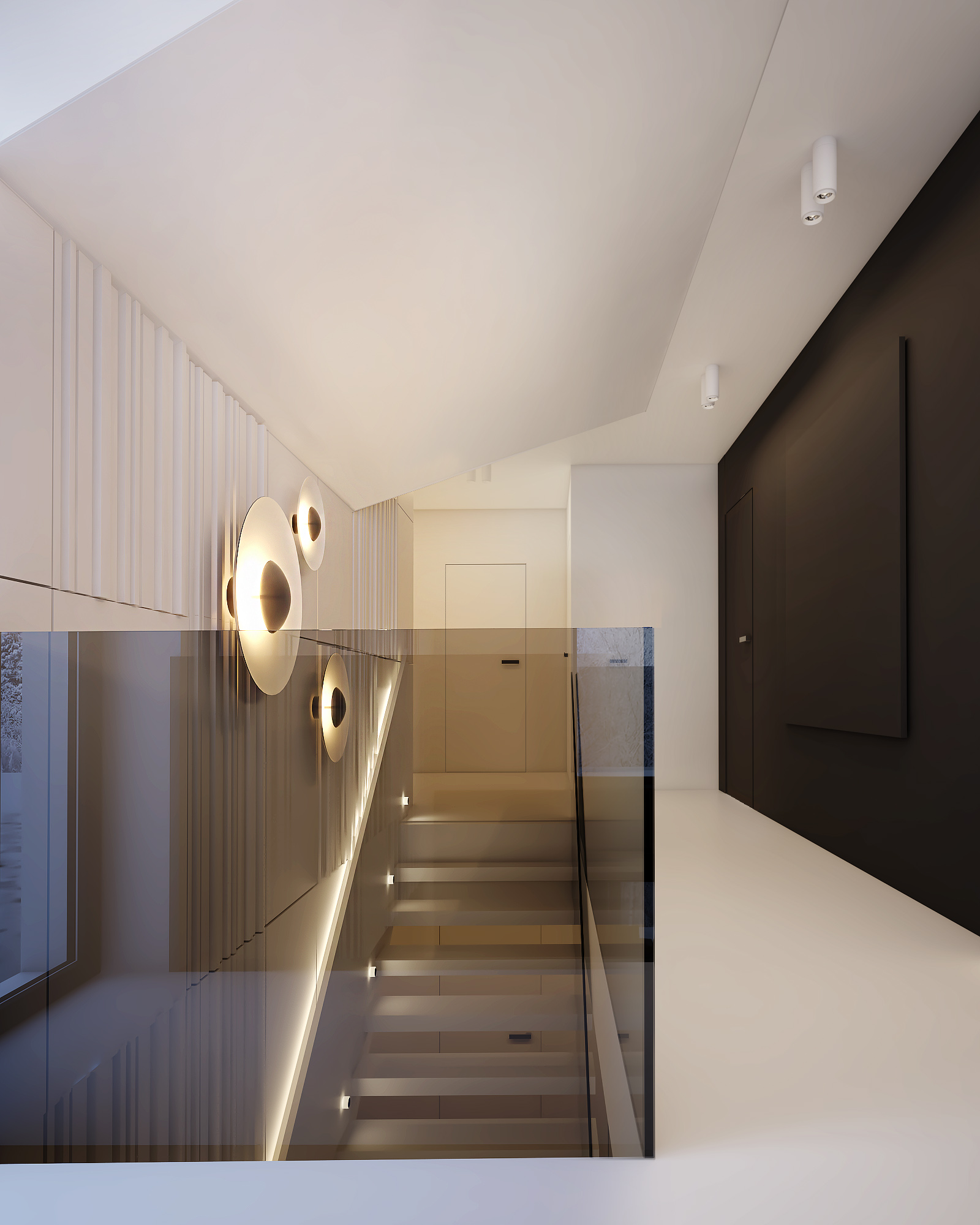 Projekt prezentuje luksusowe, ultranowoczesne wnętrza utrzymane w rygorystycznej palecie czerni, bieli i grafitu, które ocieplono nastrojowym, zintegrowanym oświetleniem LED oraz bogatymi teksturami tkanin. Strefa spa harmonijnie łączy się z pozostałymi wnętrzami domu tworząc spójną całość.