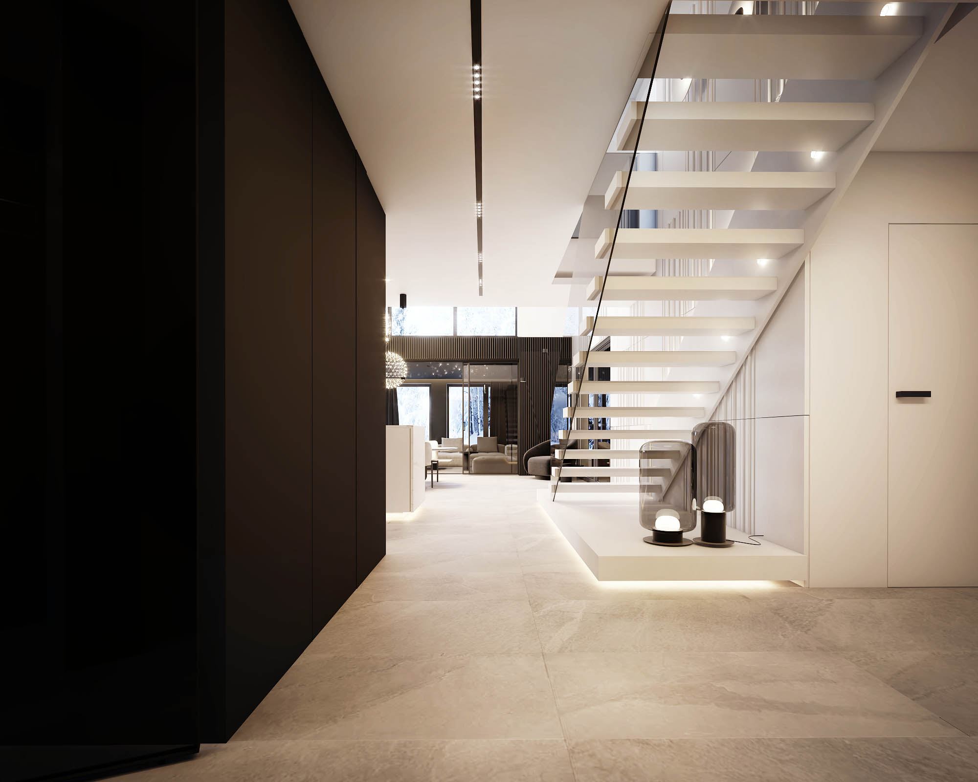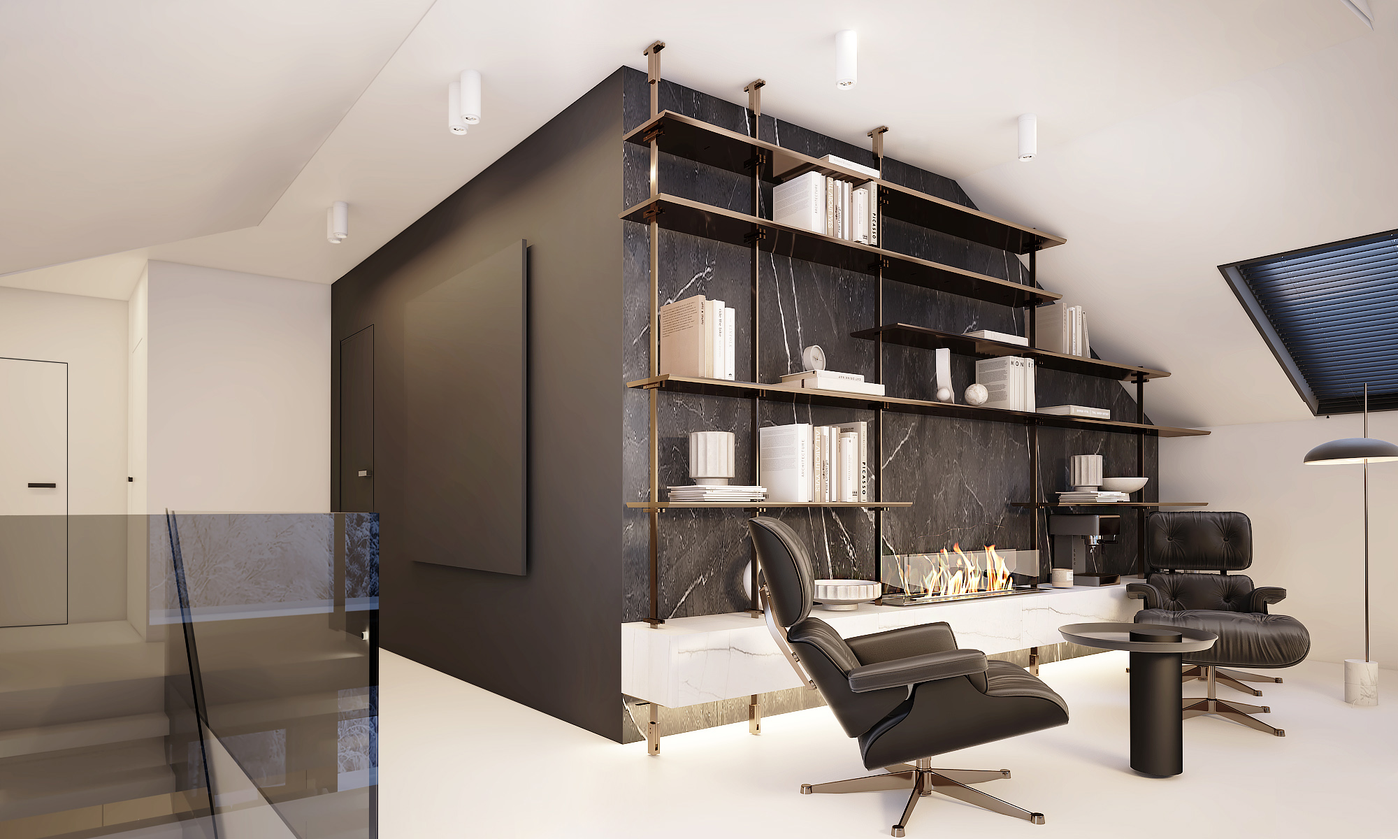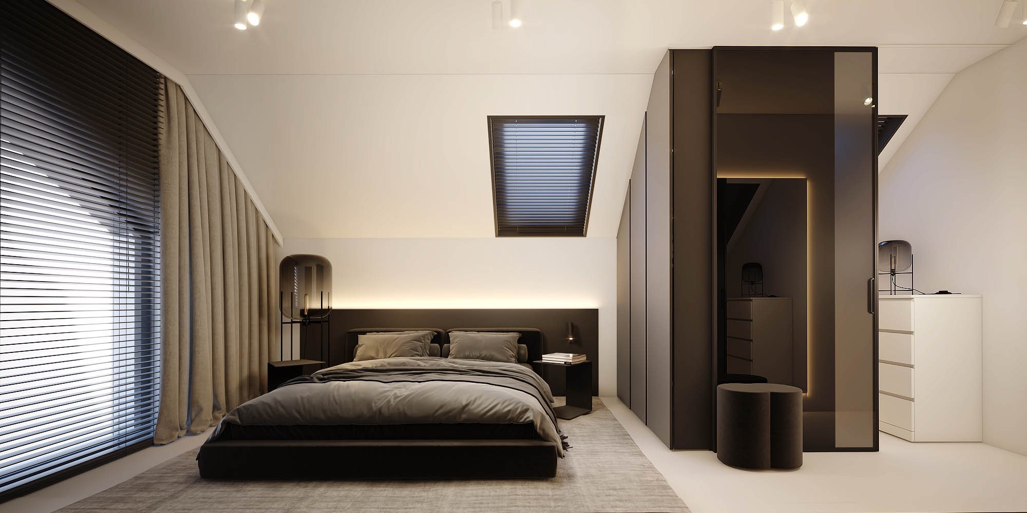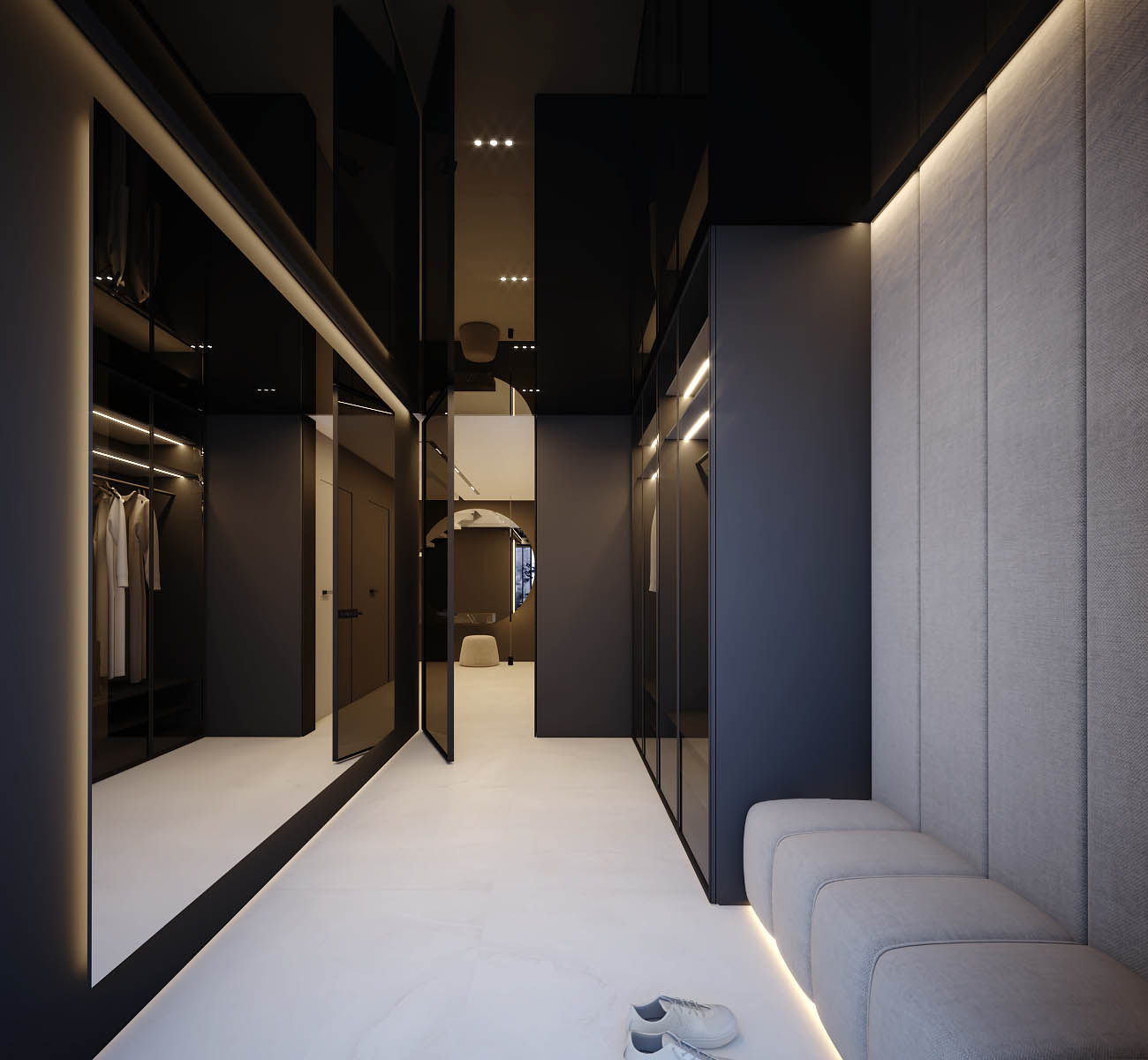Projekt prezentuje luksusowe, ultranowoczesne wnętrza utrzymane w rygorystycznej palecie czerni, bieli i grafitu, które ocieplono nastrojowym, zintegrowanym oświetleniem LED oraz bogatymi teksturami tkanin. Strefa spa harmonijnie łączy się z pozostałymi wnętrzami domu tworząc spójną całość.