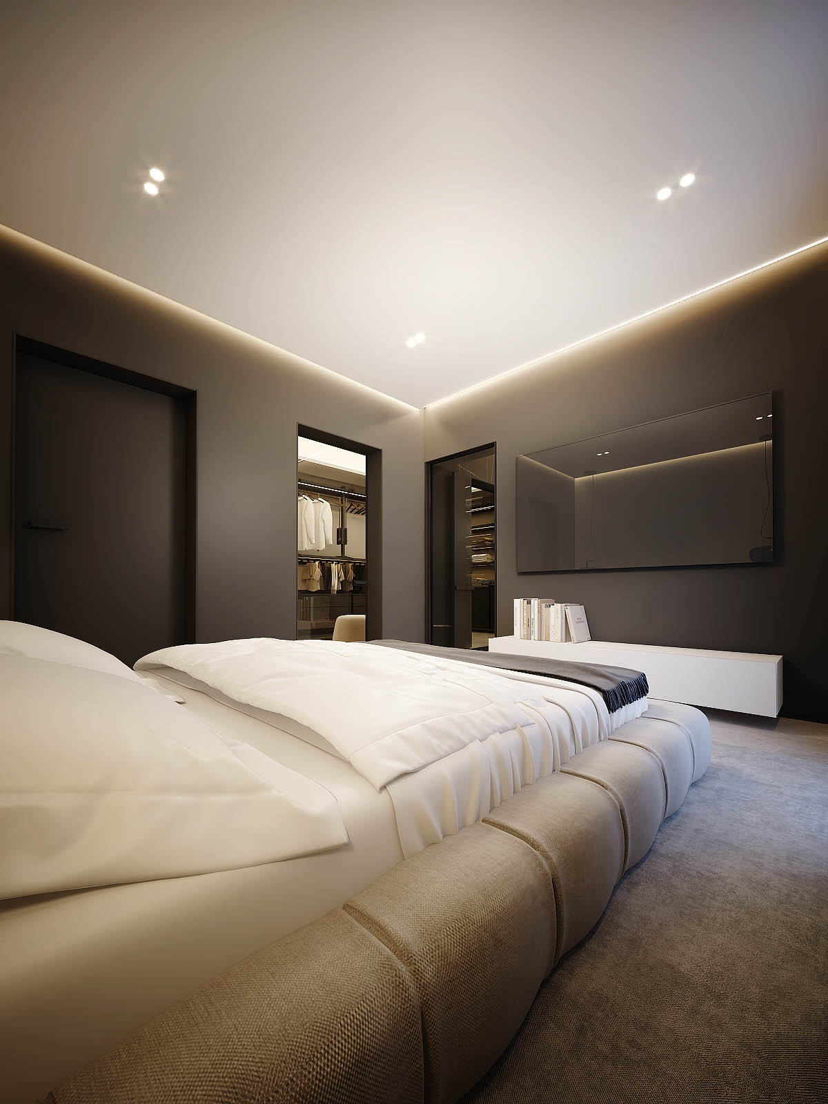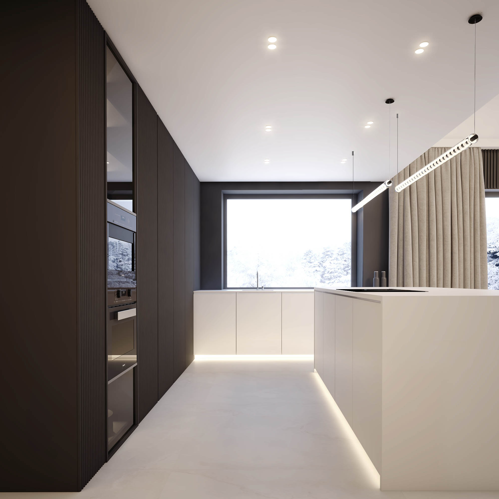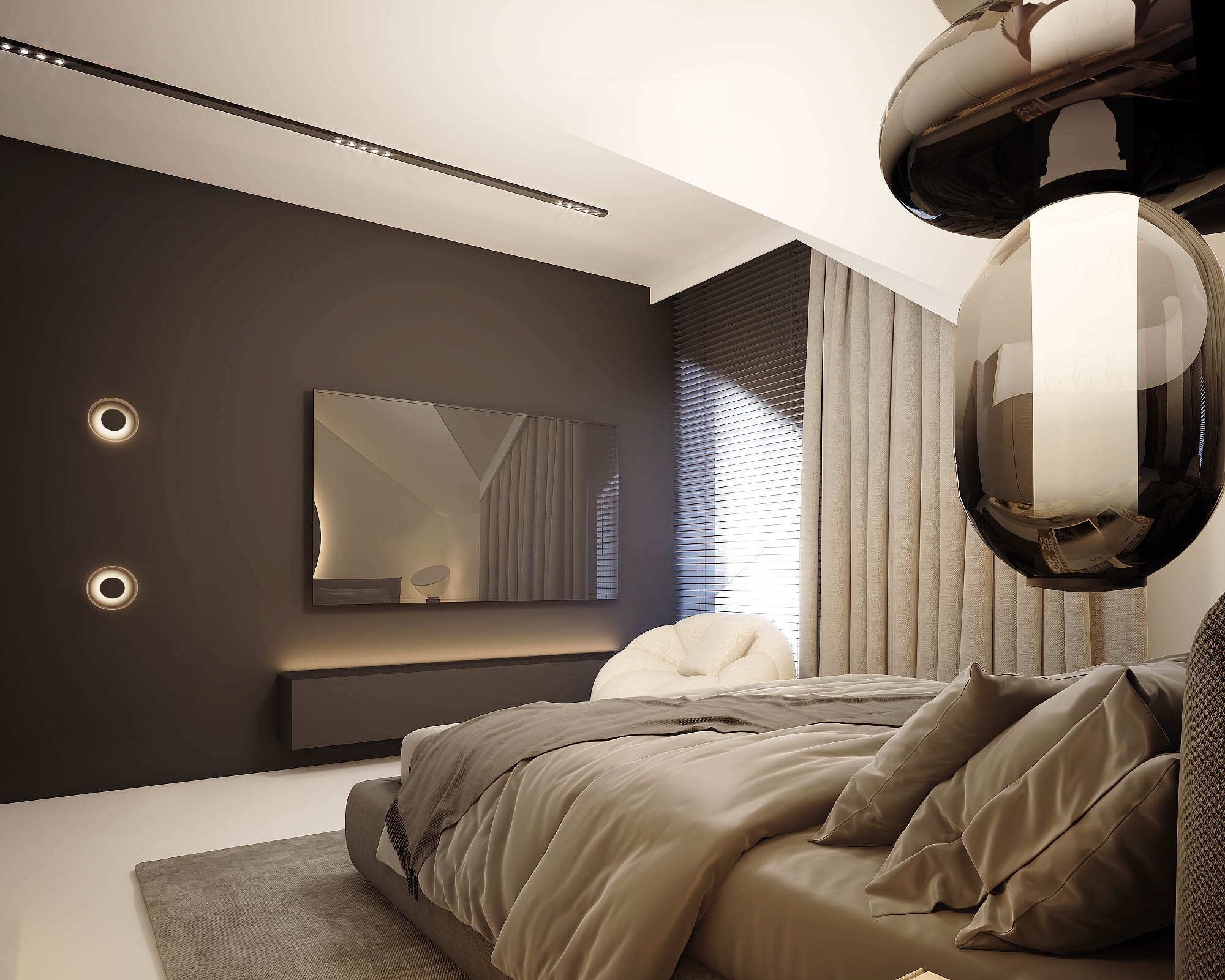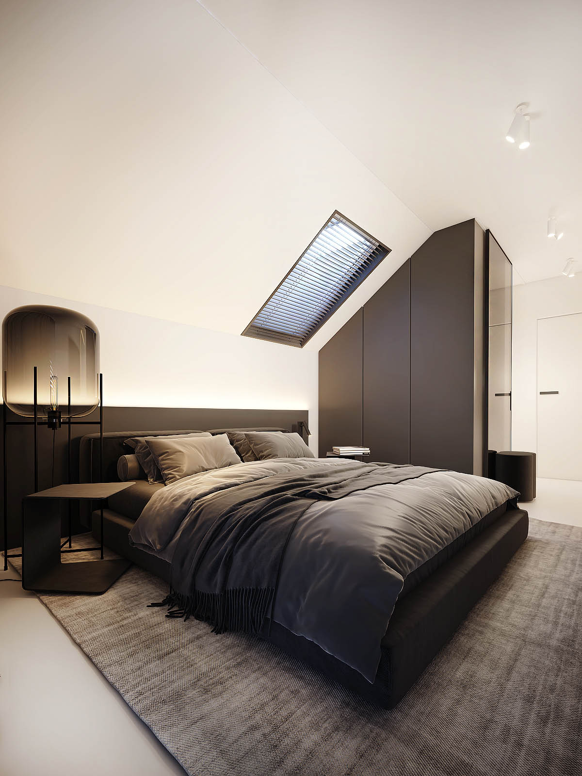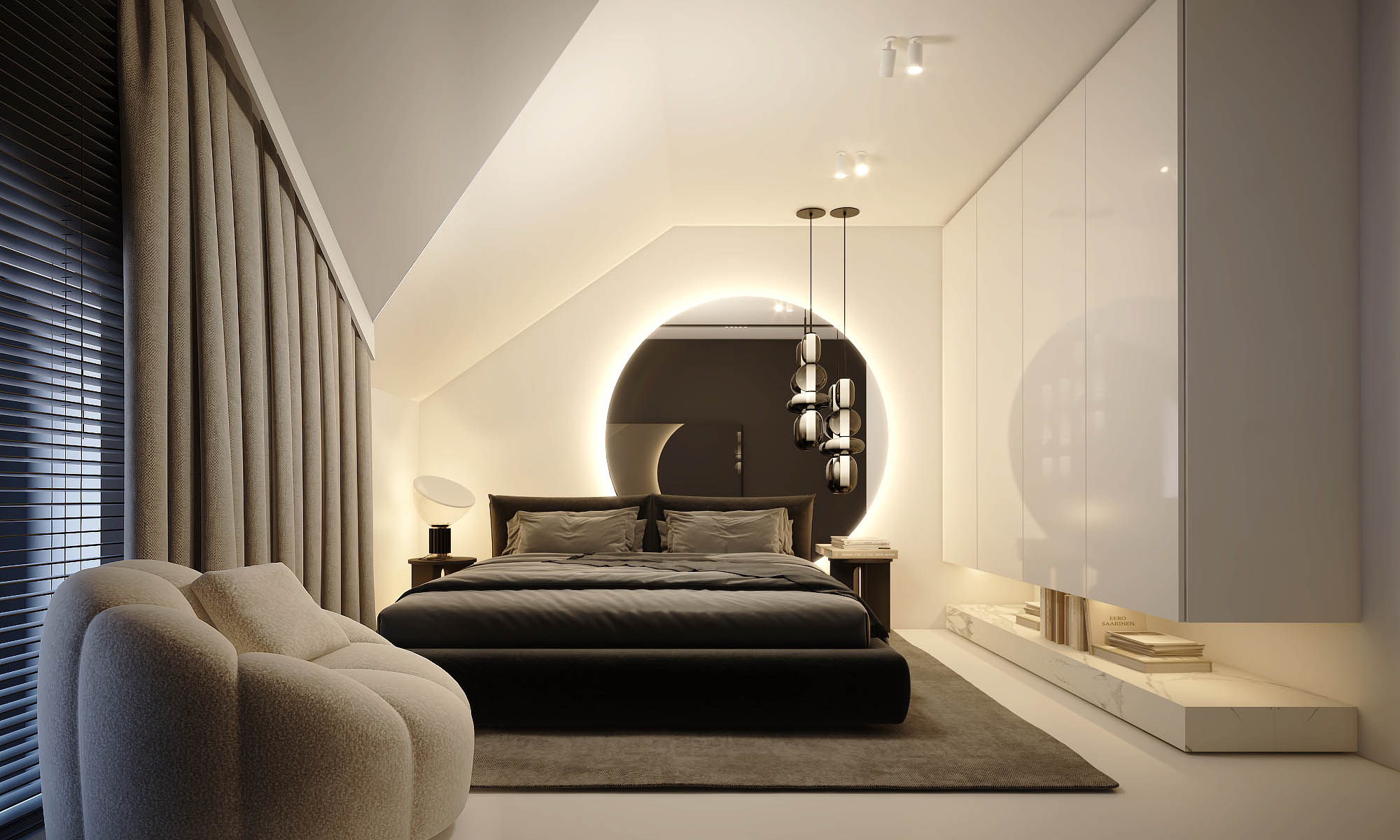Projekt prezentuje luksusowe, ultranowoczesne wnętrza utrzymane w rygorystycznej palecie czerni, bieli i grafitu, które ocieplono nastrojowym, zintegrowanym oświetleniem LED oraz bogatymi teksturami tkanin. Strefa spa harmonijnie łączy się z pozostałymi wnętrzami domu tworząc spójną całość.