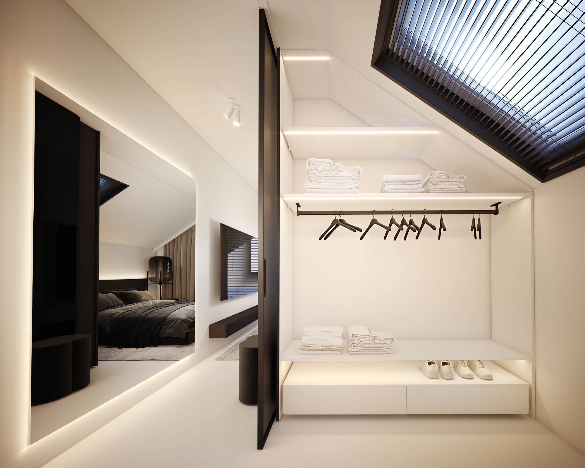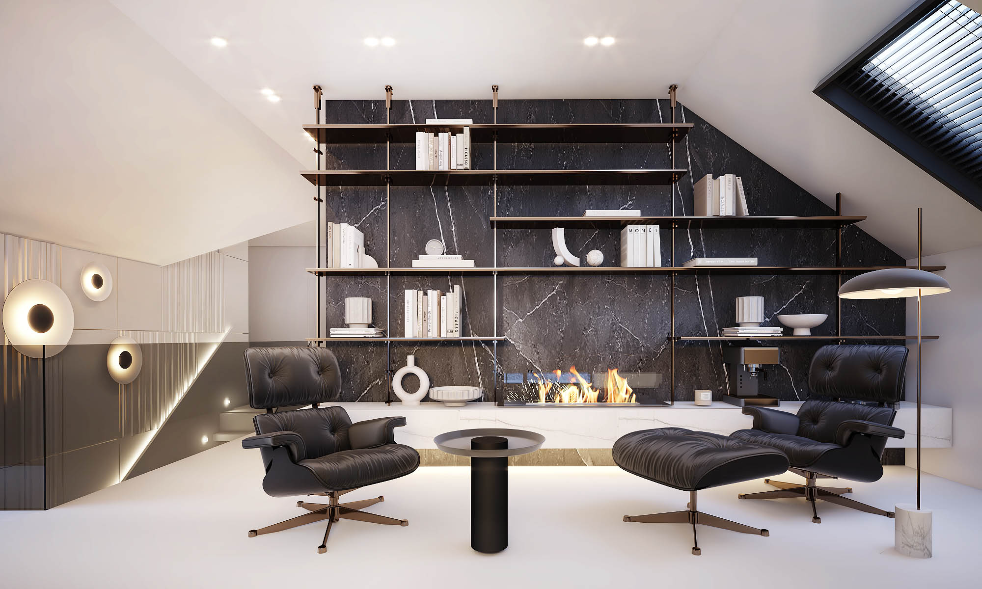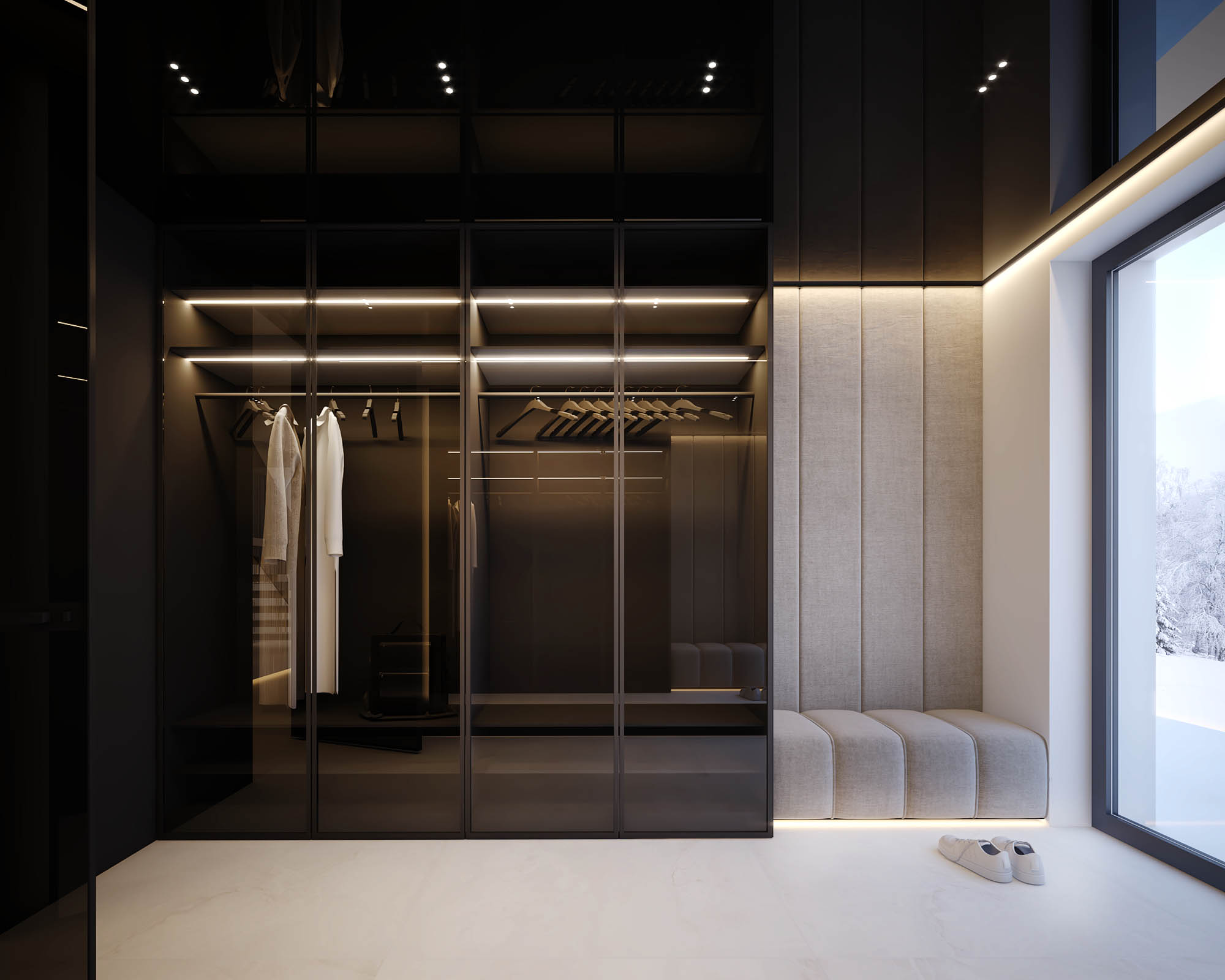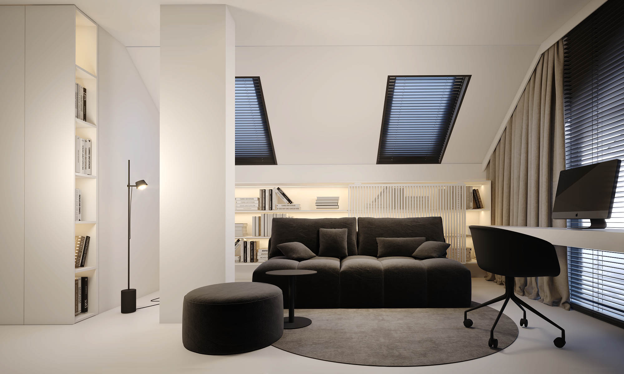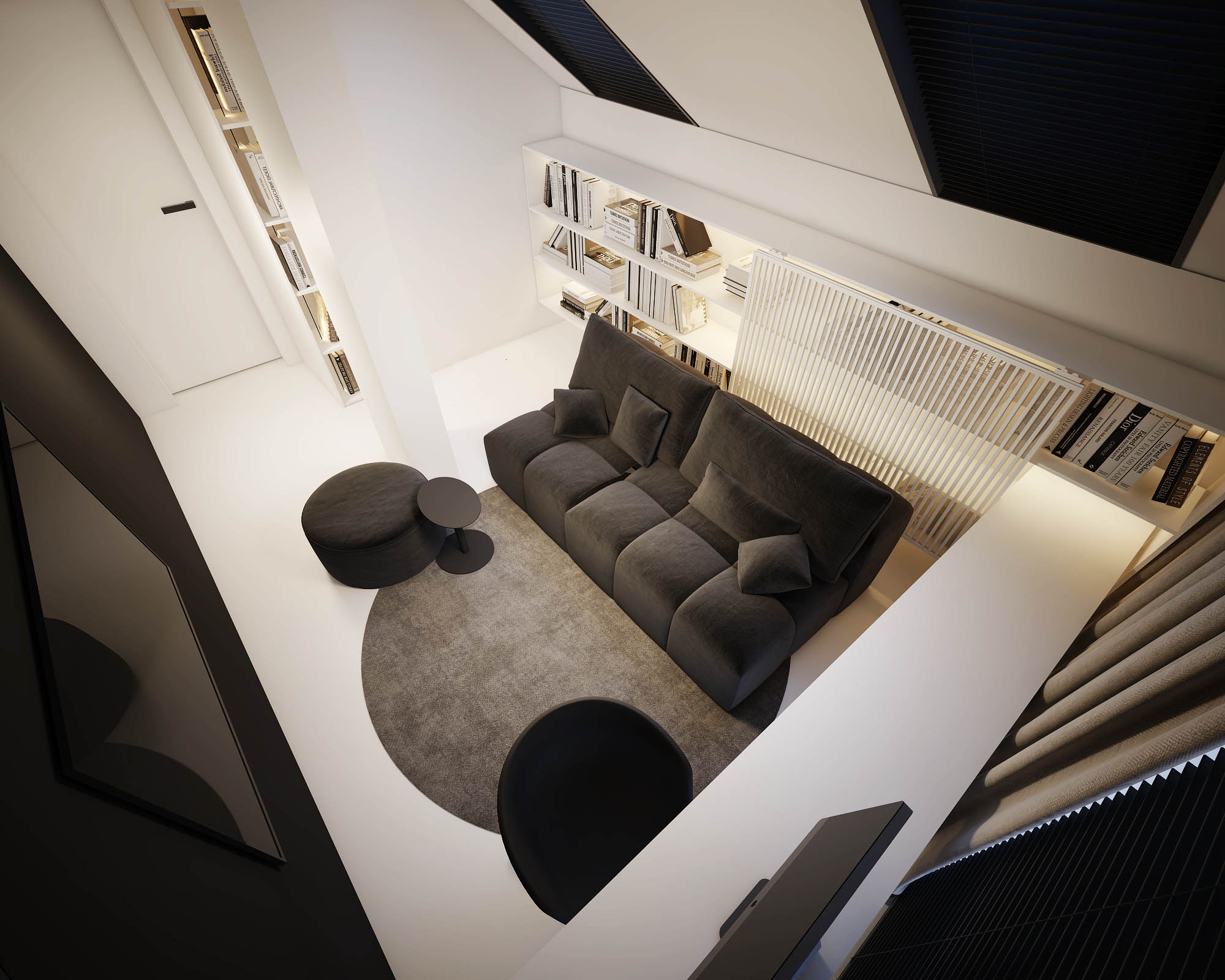 Projekt prezentuje luksusowe, ultranowoczesne wnętrza utrzymane w rygorystycznej palecie czerni, bieli i grafitu, które ocieplono nastrojowym, zintegrowanym oświetleniem LED oraz bogatymi teksturami tkanin. Strefa spa harmonijnie łączy się z pozostałymi wnętrzami domu tworząc spójną całość.