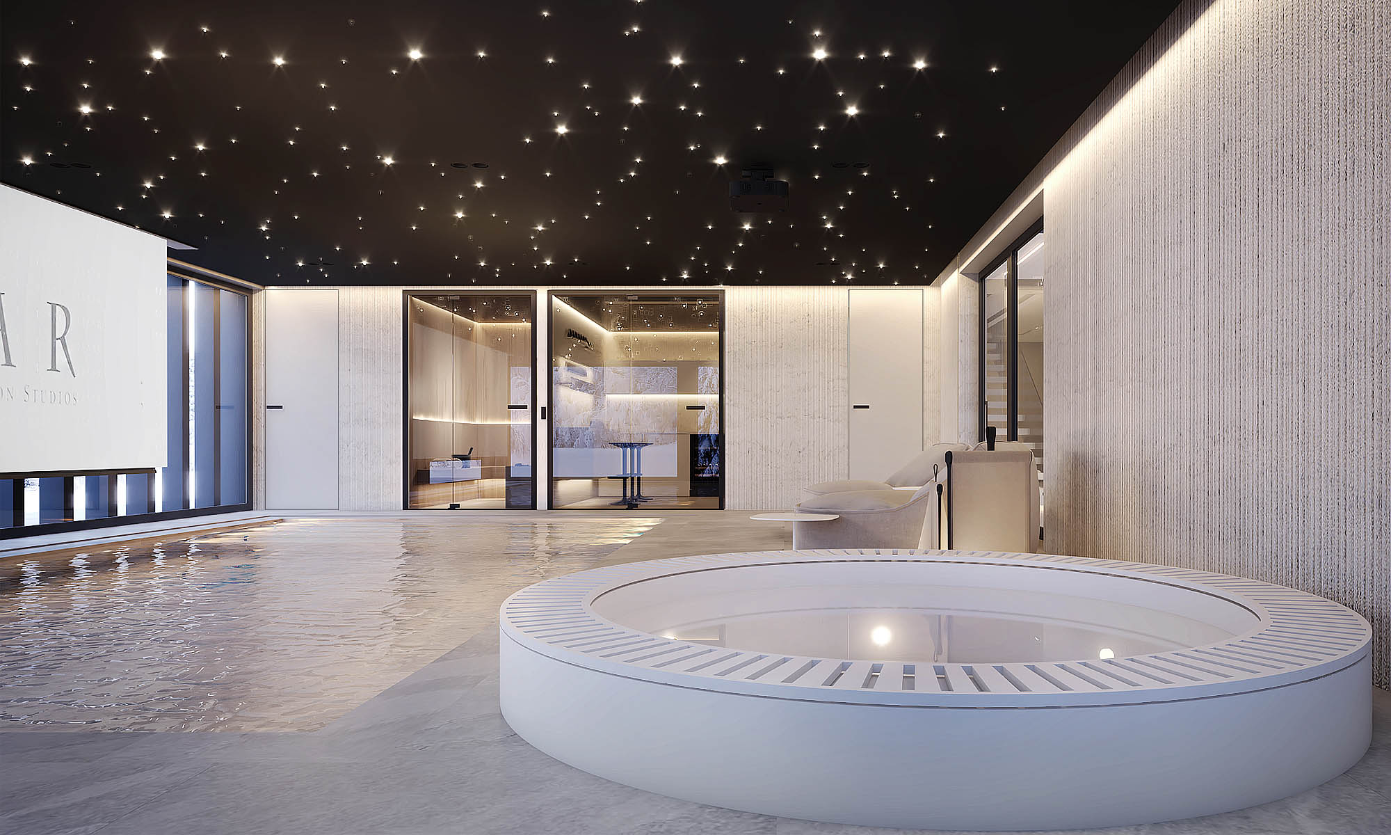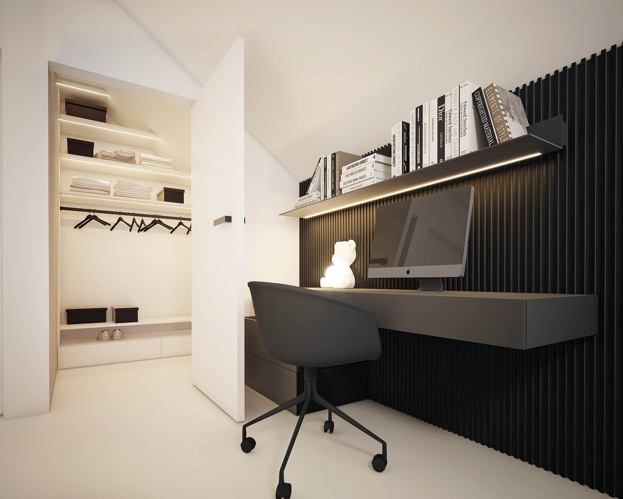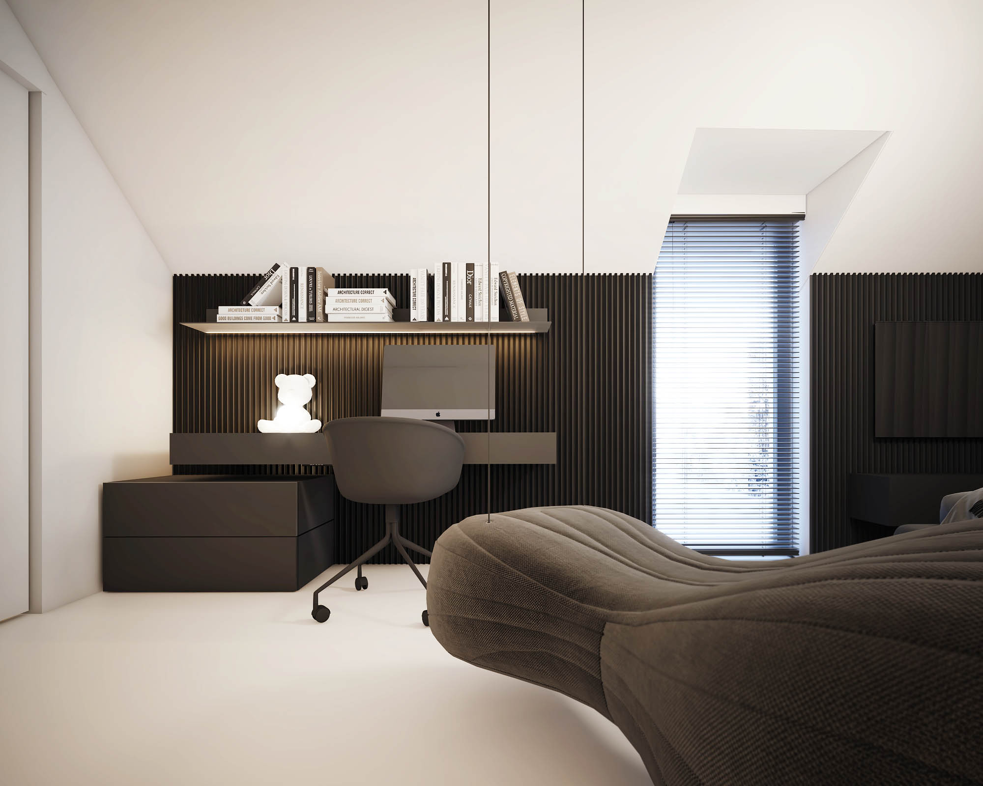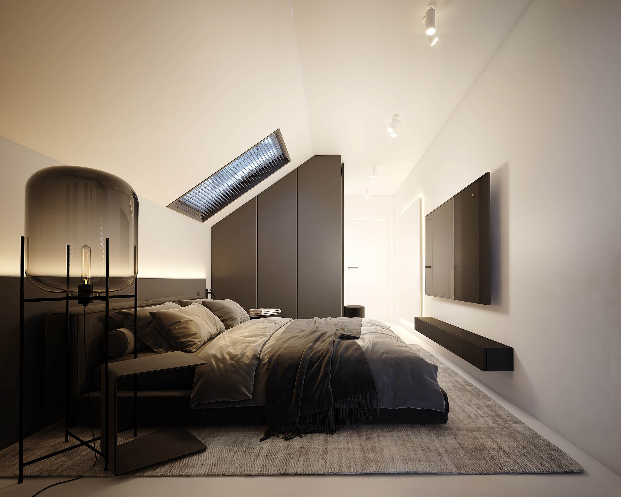 Projekt prezentuje luksusowe, ultranowoczesne wnętrza utrzymane w rygorystycznej palecie czerni, bieli i grafitu, które ocieplono nastrojowym, zintegrowanym oświetleniem LED oraz bogatymi teksturami tkanin. Strefa spa harmonijnie łączy się z pozostałymi wnętrzami domu tworząc spójną całość.