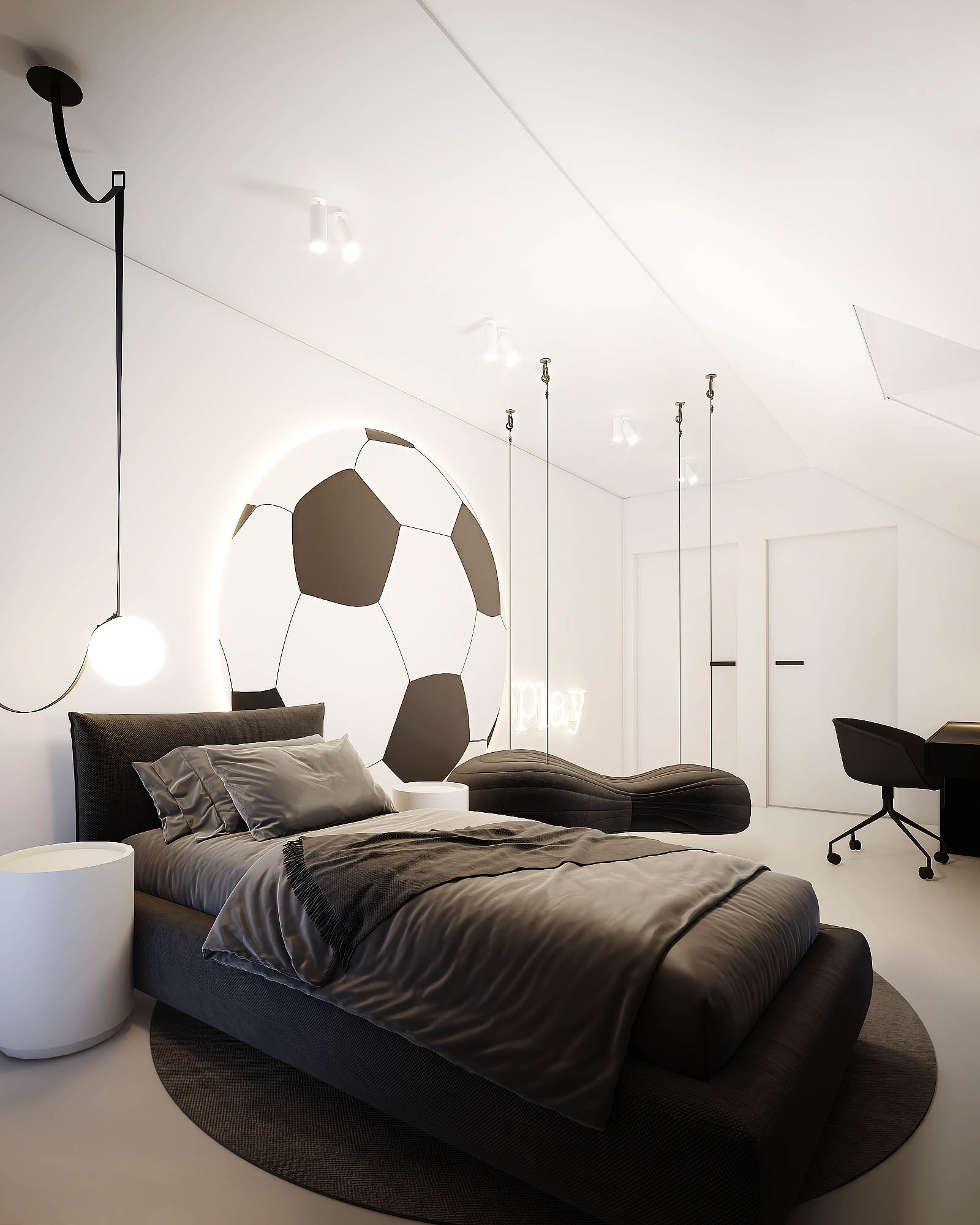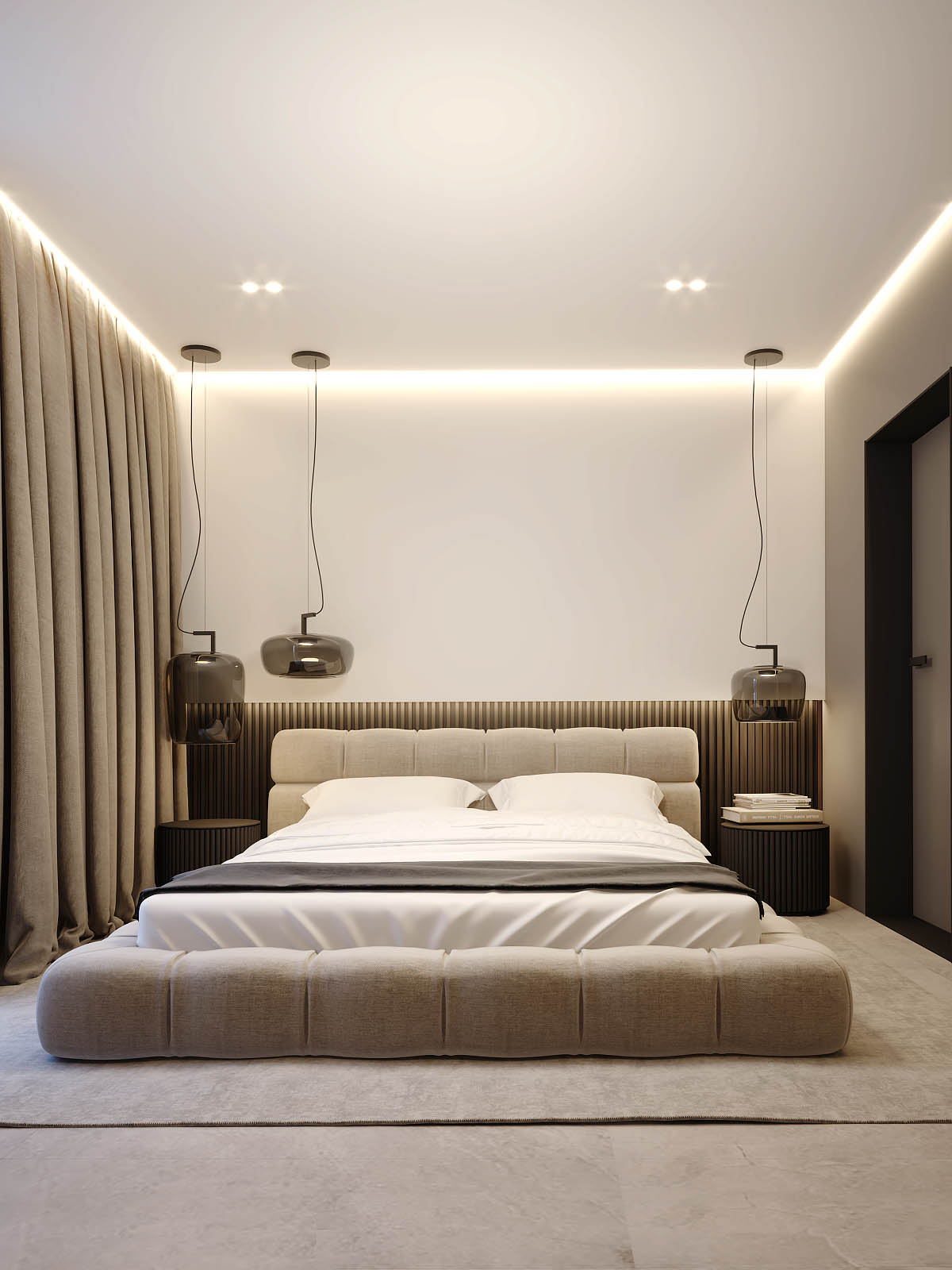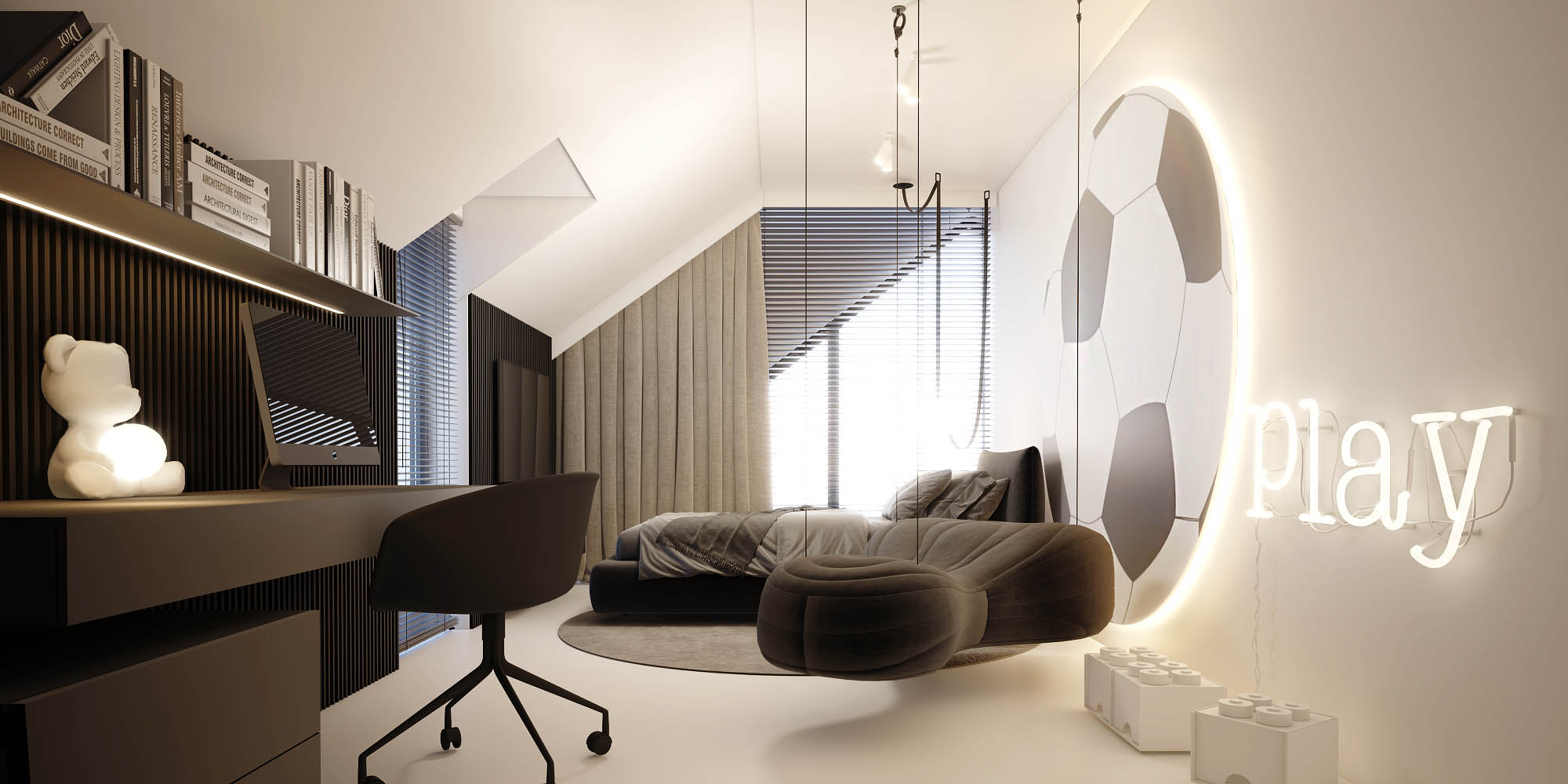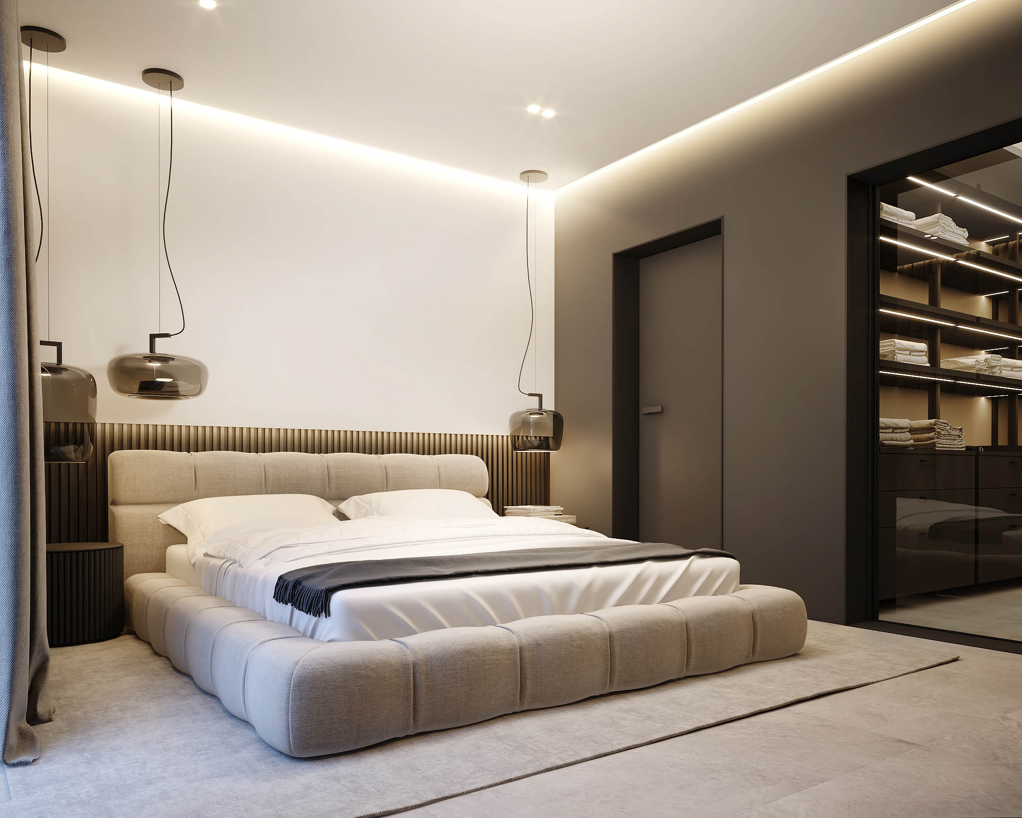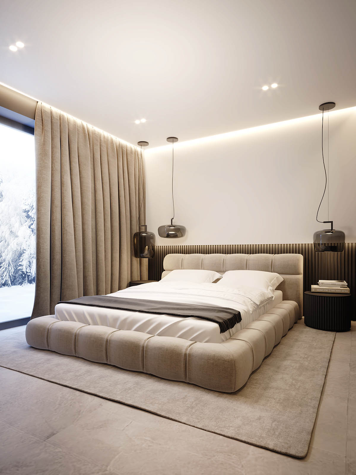 Projekt prezentuje luksusowe, ultranowoczesne wnętrza utrzymane w rygorystycznej palecie czerni, bieli i grafitu, które ocieplono nastrojowym, zintegrowanym oświetleniem LED oraz bogatymi teksturami tkanin. Strefa spa harmonijnie łączy się z pozostałymi wnętrzami domu tworząc spójną całość.