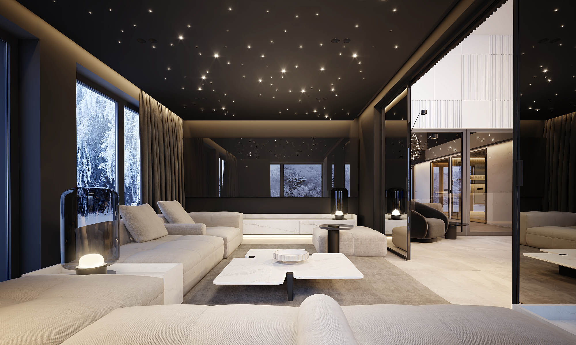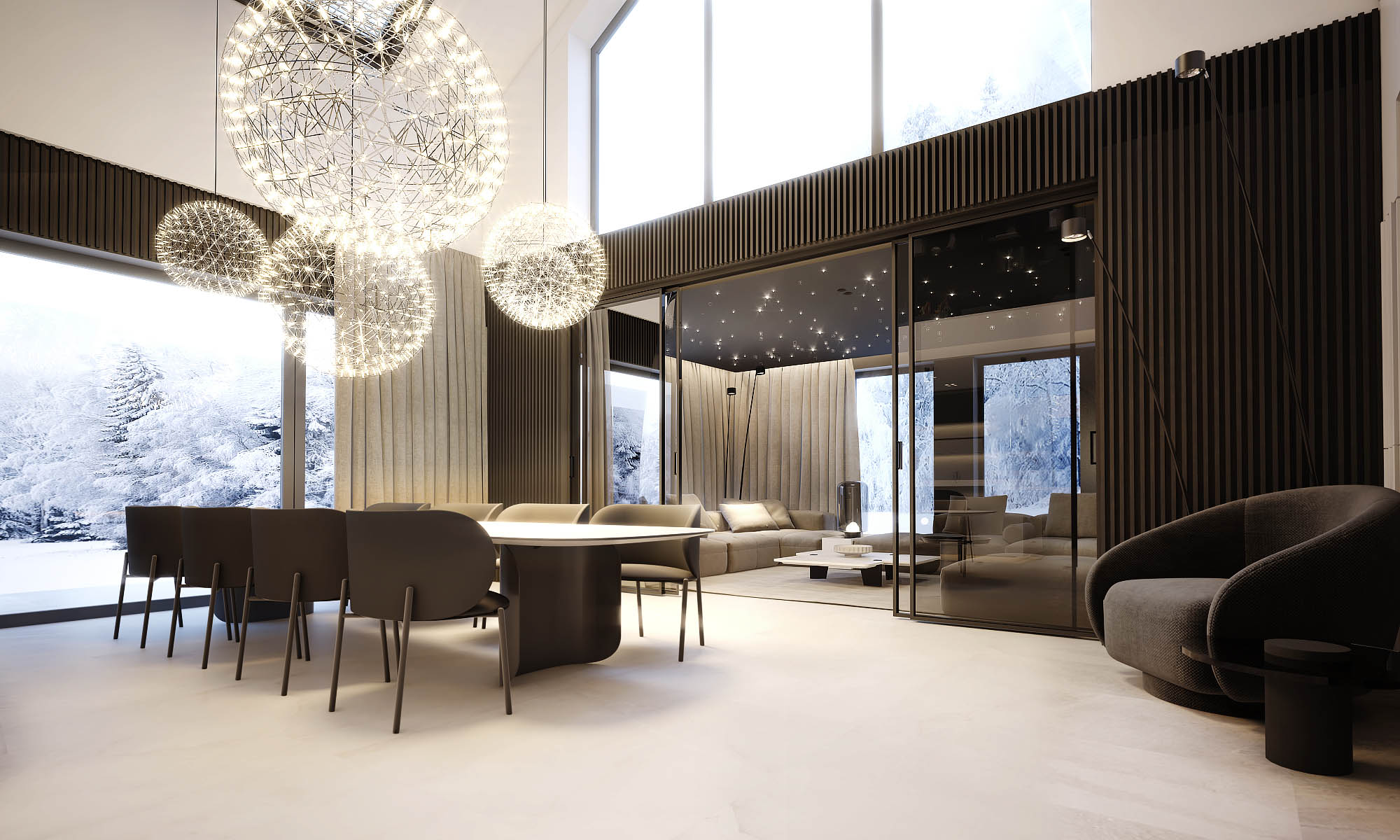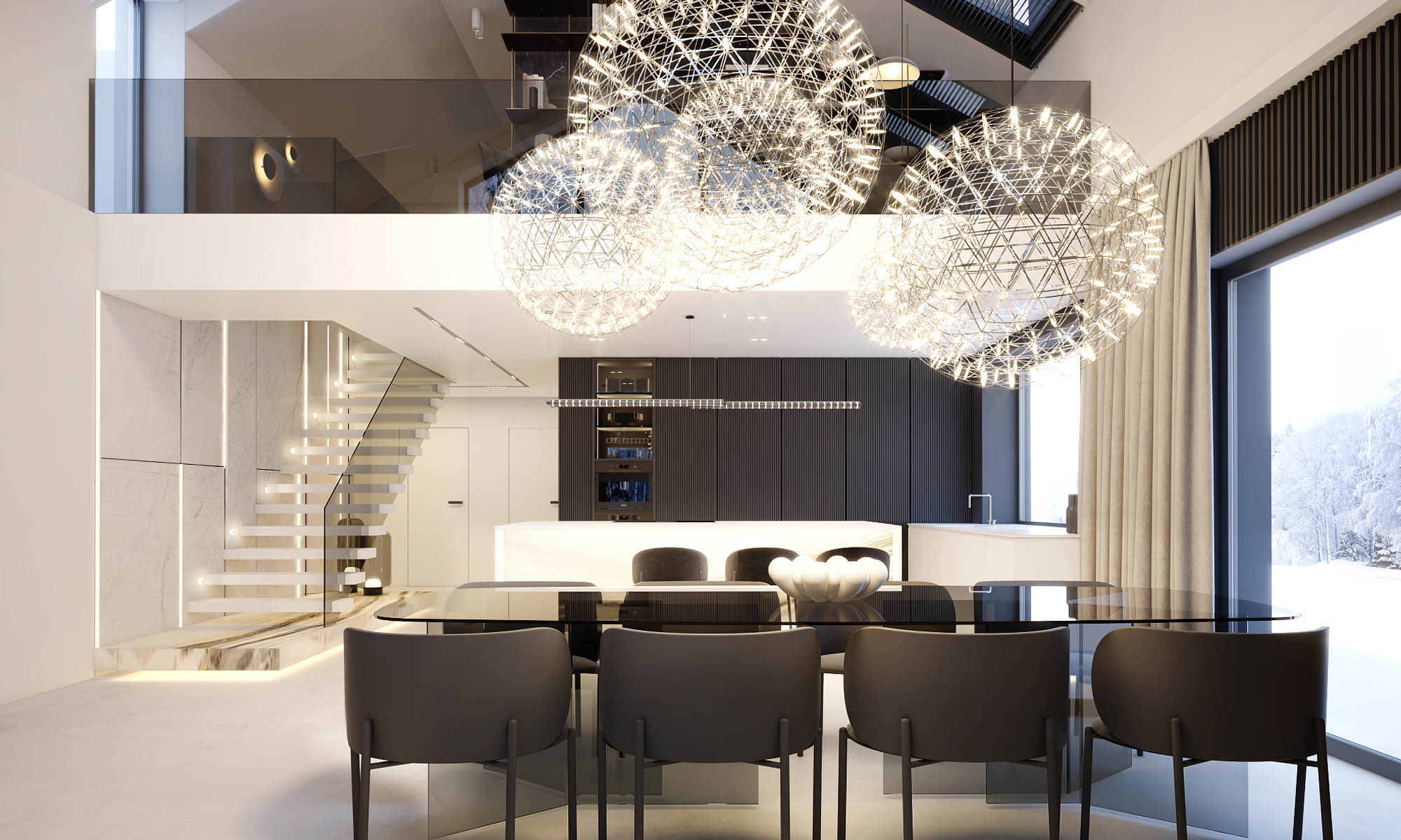 Przestrzeń charakteryzuje się architektoniczną precyzją, widoczną w pionowych lamelach, wielkoformatowych przeszkleniach otwierających dom na krajobraz oraz oprawach oświetleniowych, takich jak gwieździsty sufit czy spektakularne żyrandole.
