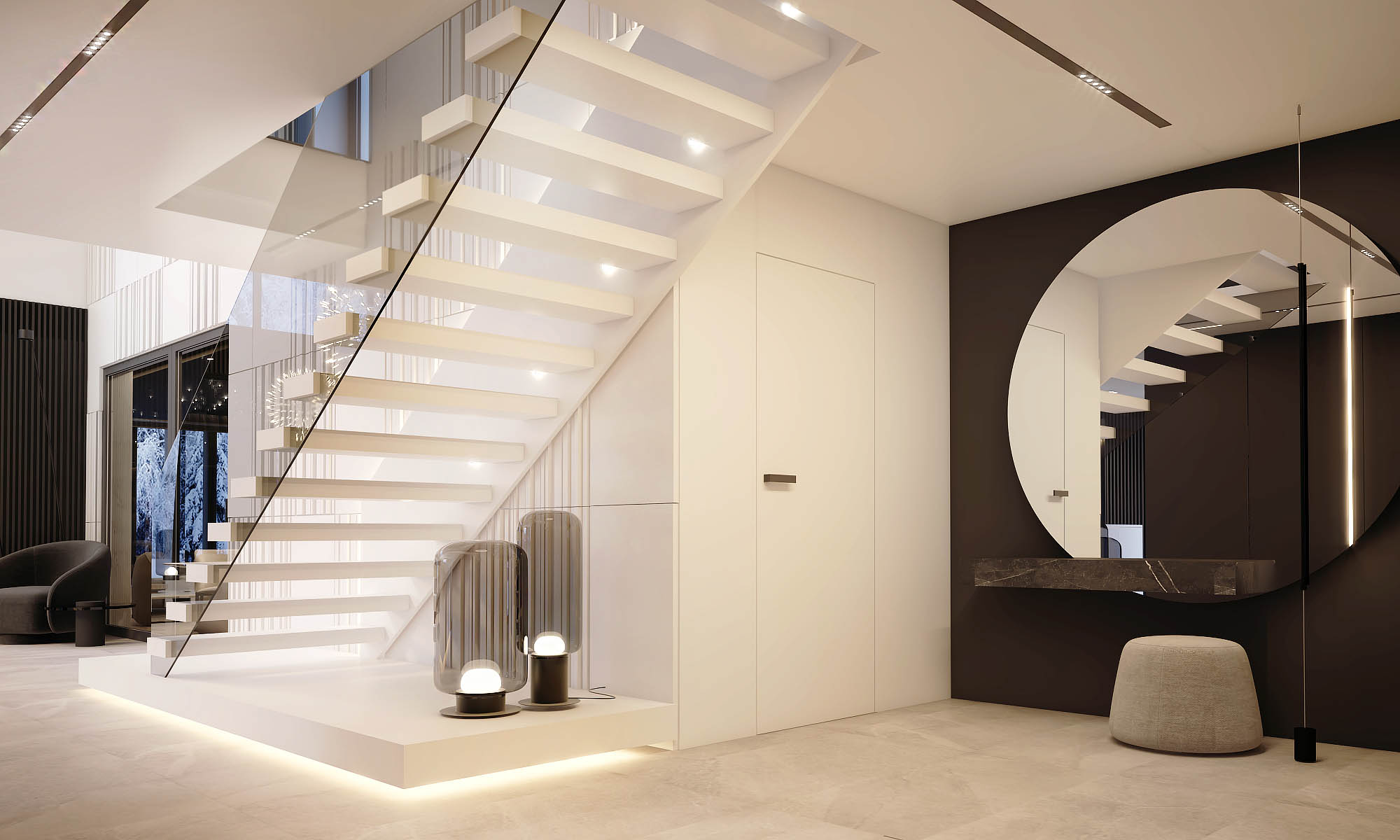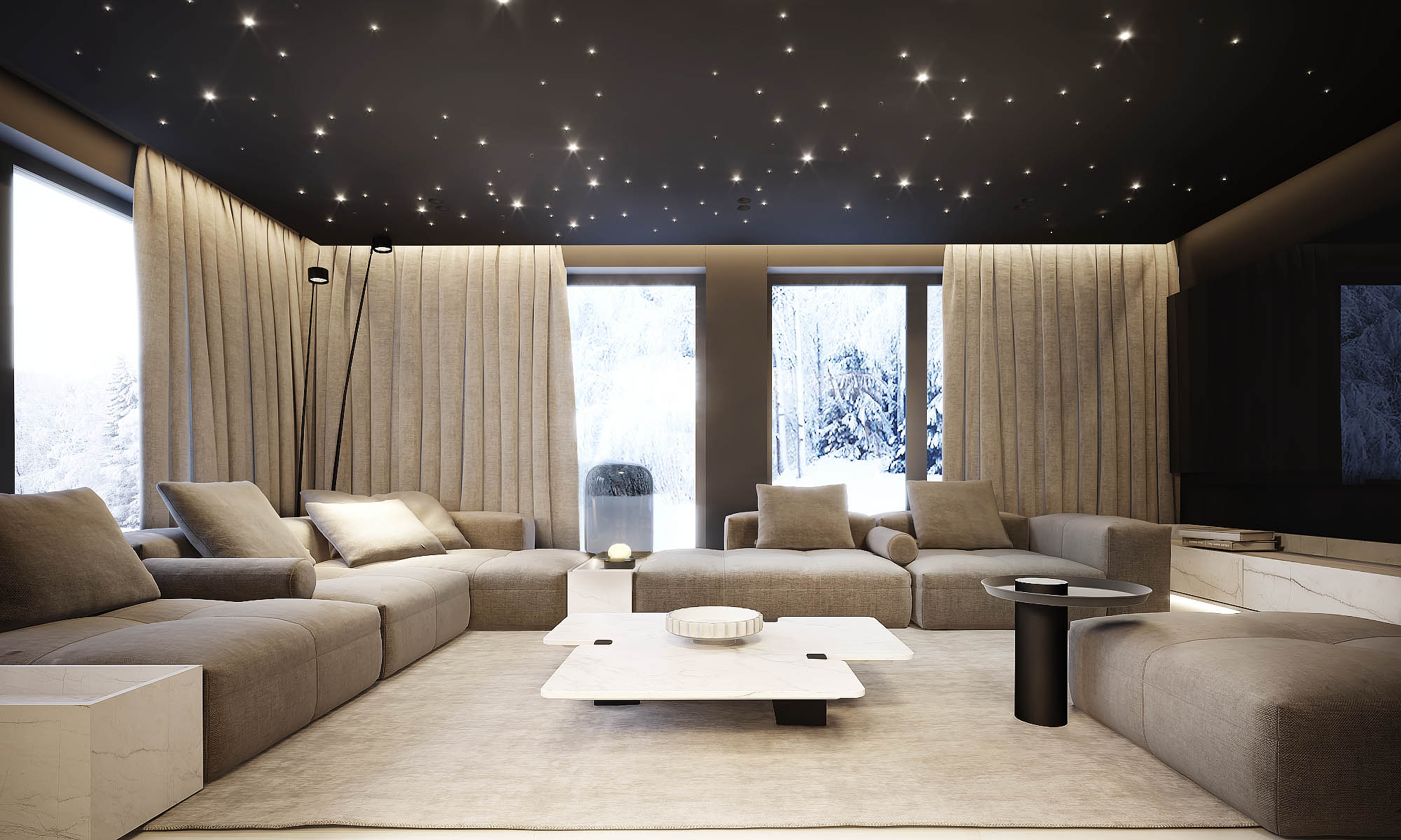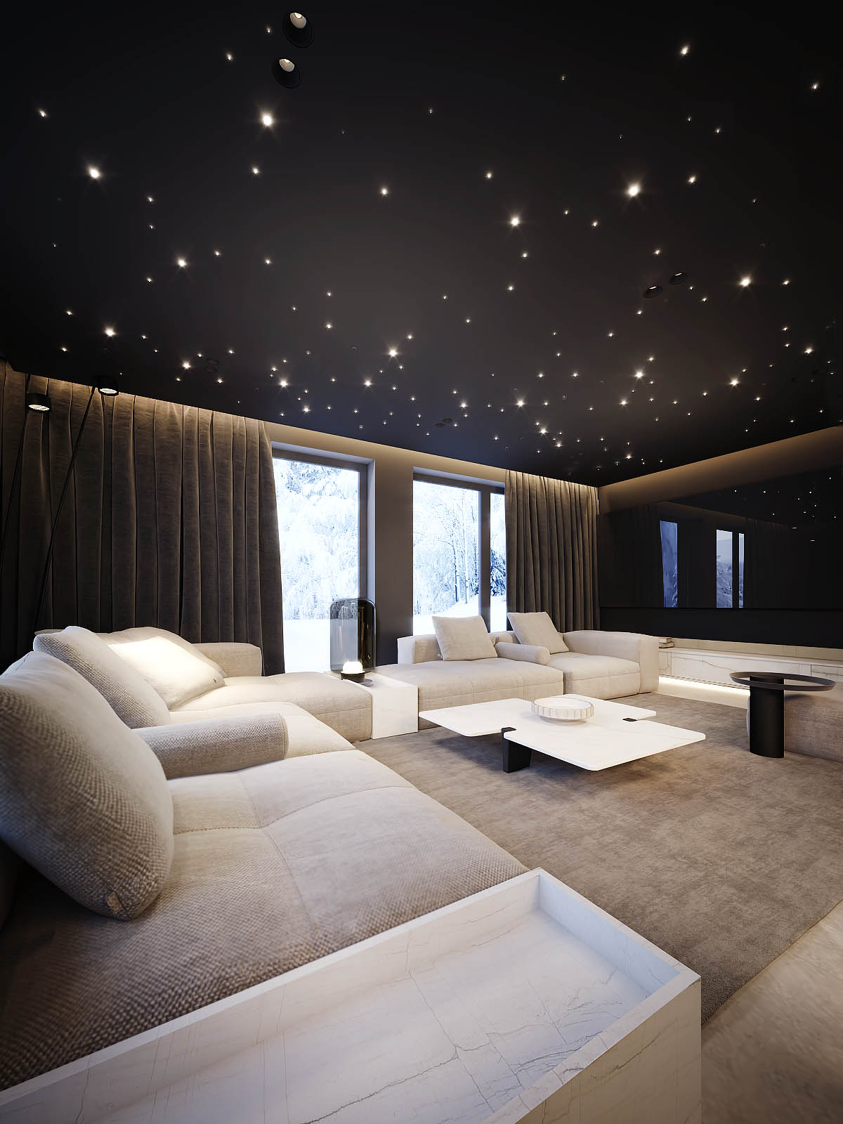 Przestrzeń charakteryzuje się architektoniczną precyzją, widoczną w pionowych lamelach, wielkoformatowych przeszkleniach otwierających dom na krajobraz oraz oprawach oświetleniowych, takich jak gwieździsty sufit czy spektakularne żyrandole.