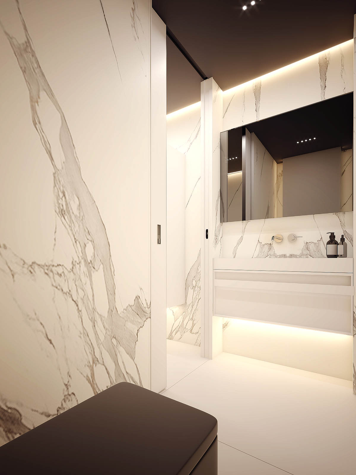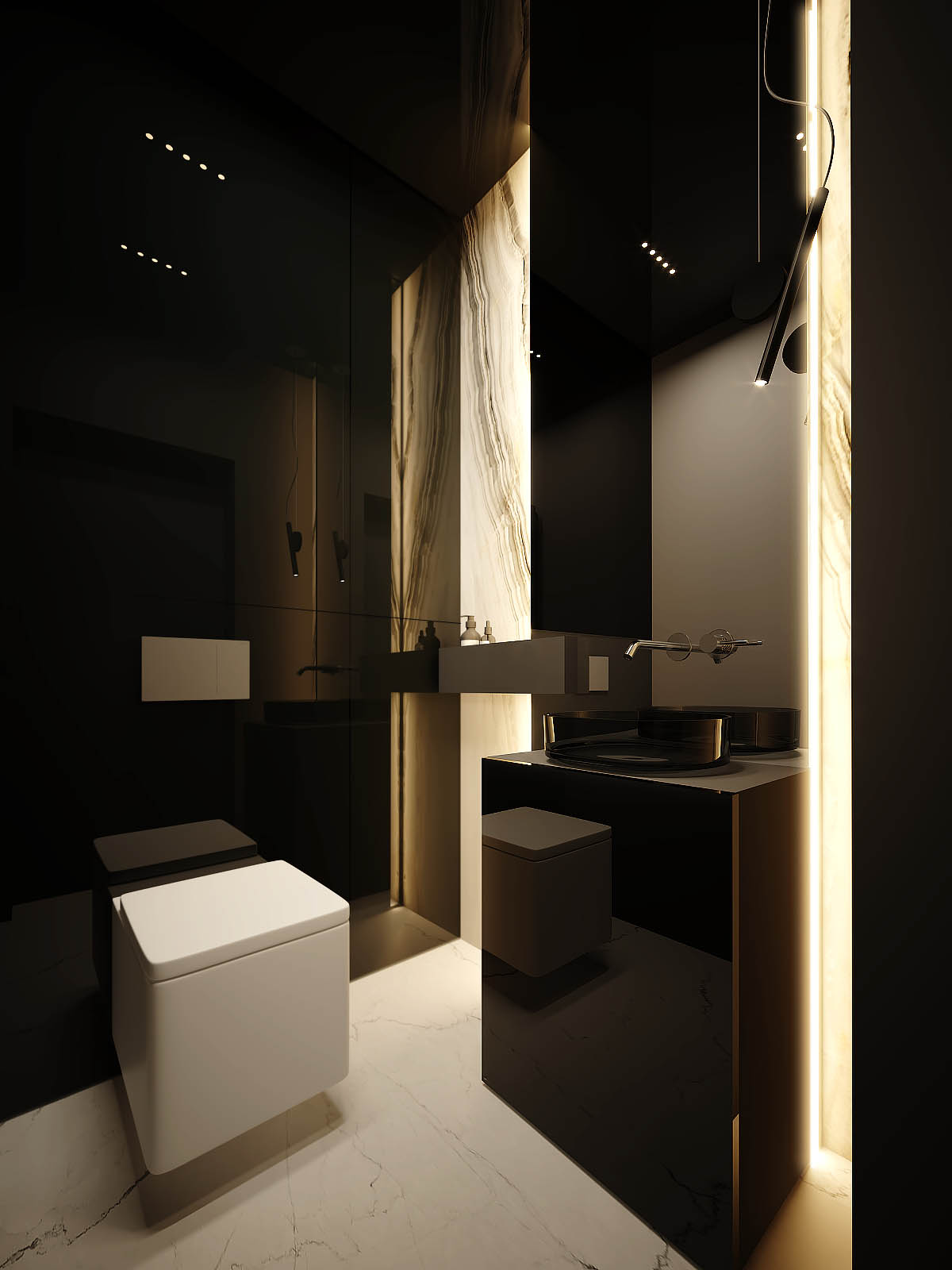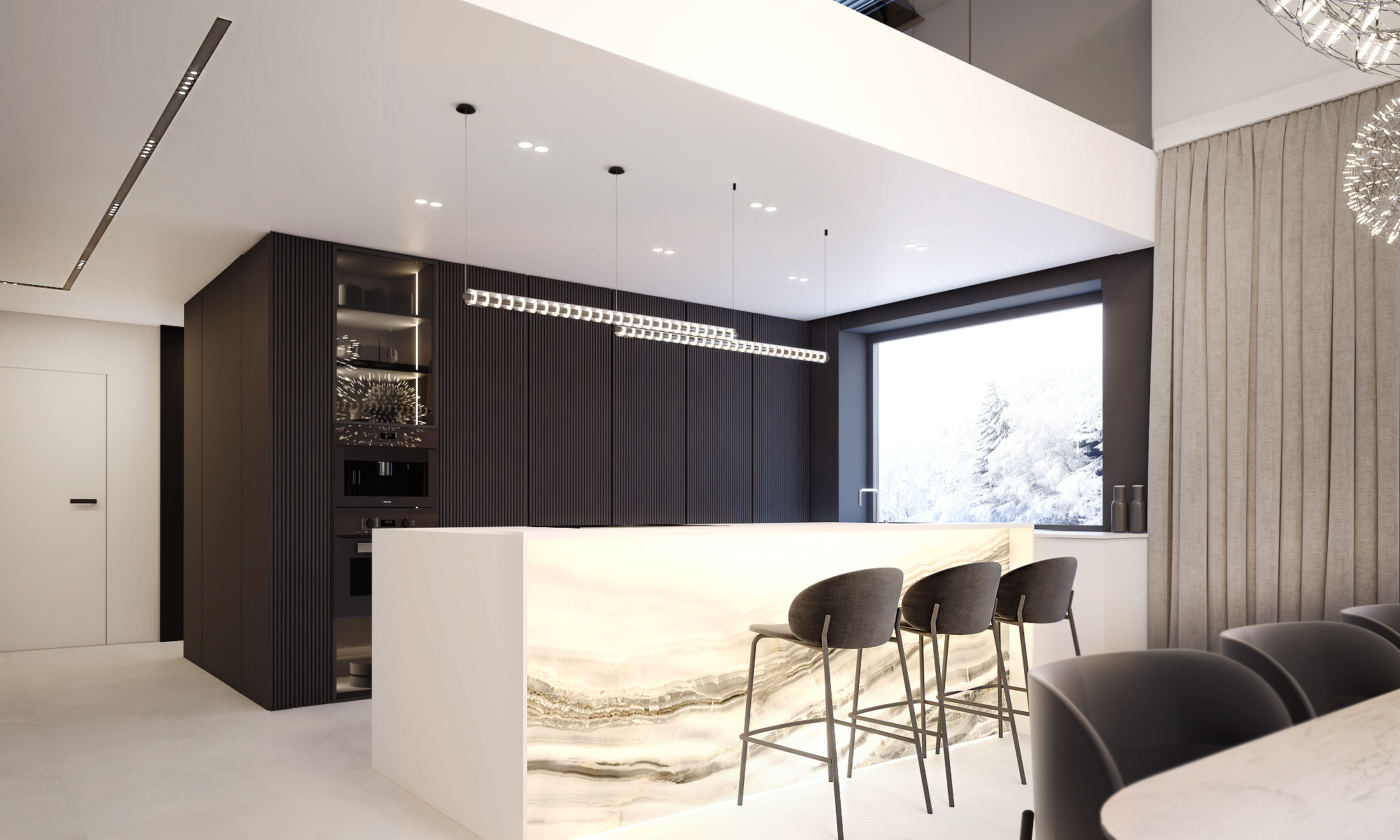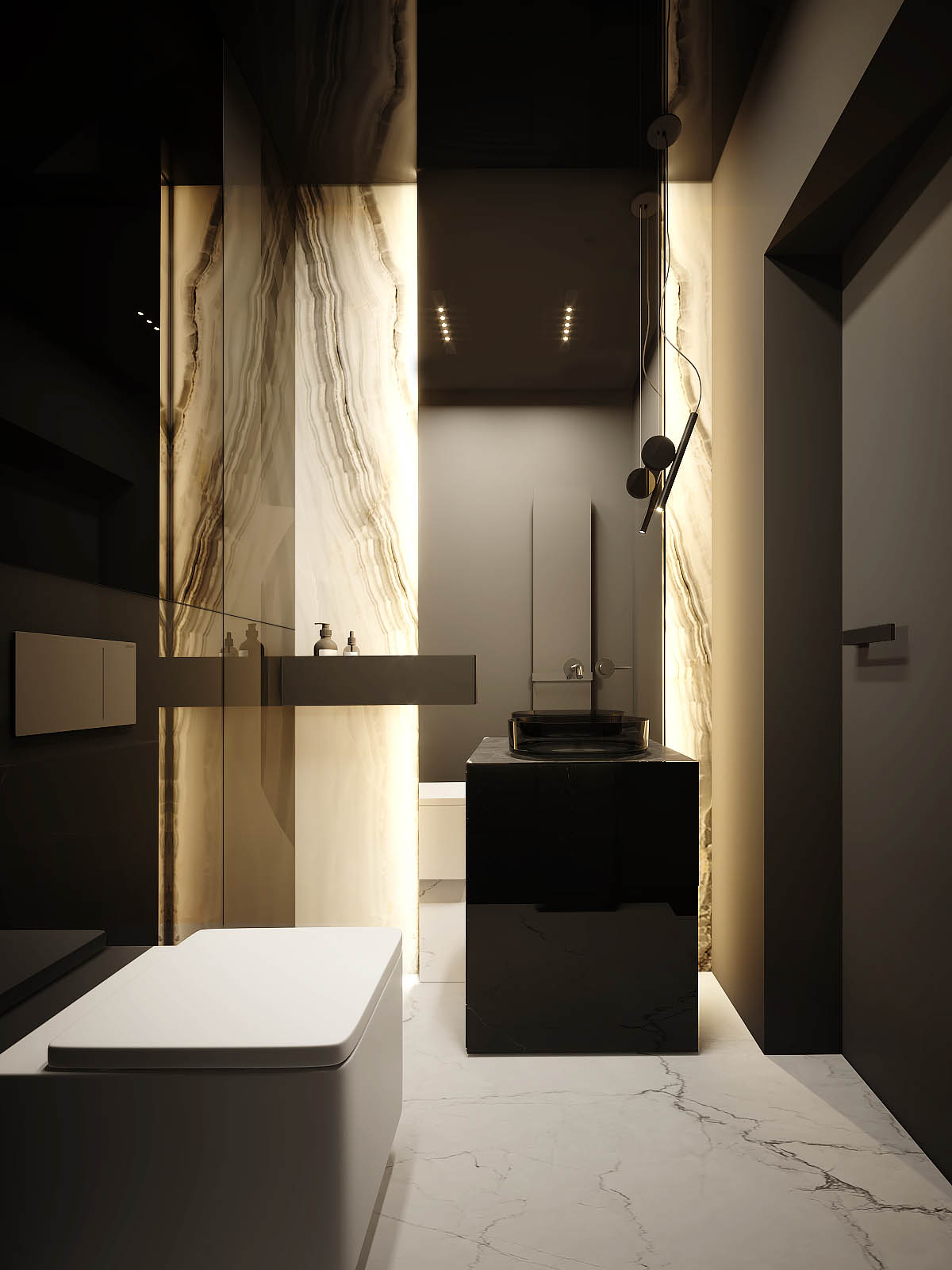 Całość aranżacji balansuje między surowym minimalizmem a wyrafinowanym komfortem, wykorzystując szlachetne materiały – m.in. podświetlony onyks, wielkoformatowe spieki i połyskujące, ciemne płaszczyzny – dla uzyskania efektu głębi i ponadczasowej elegancji.