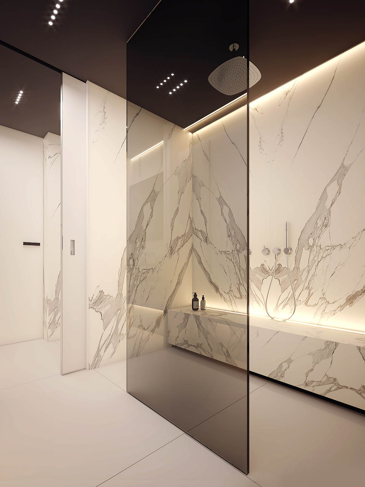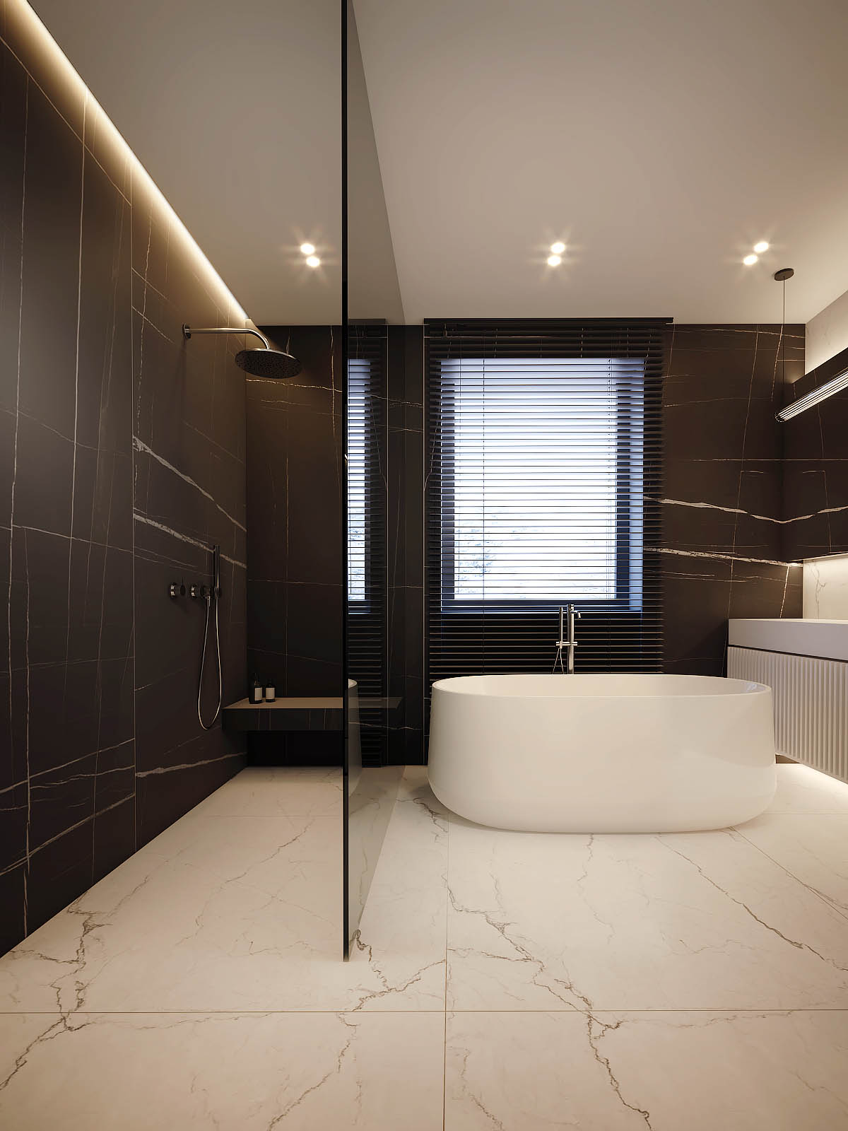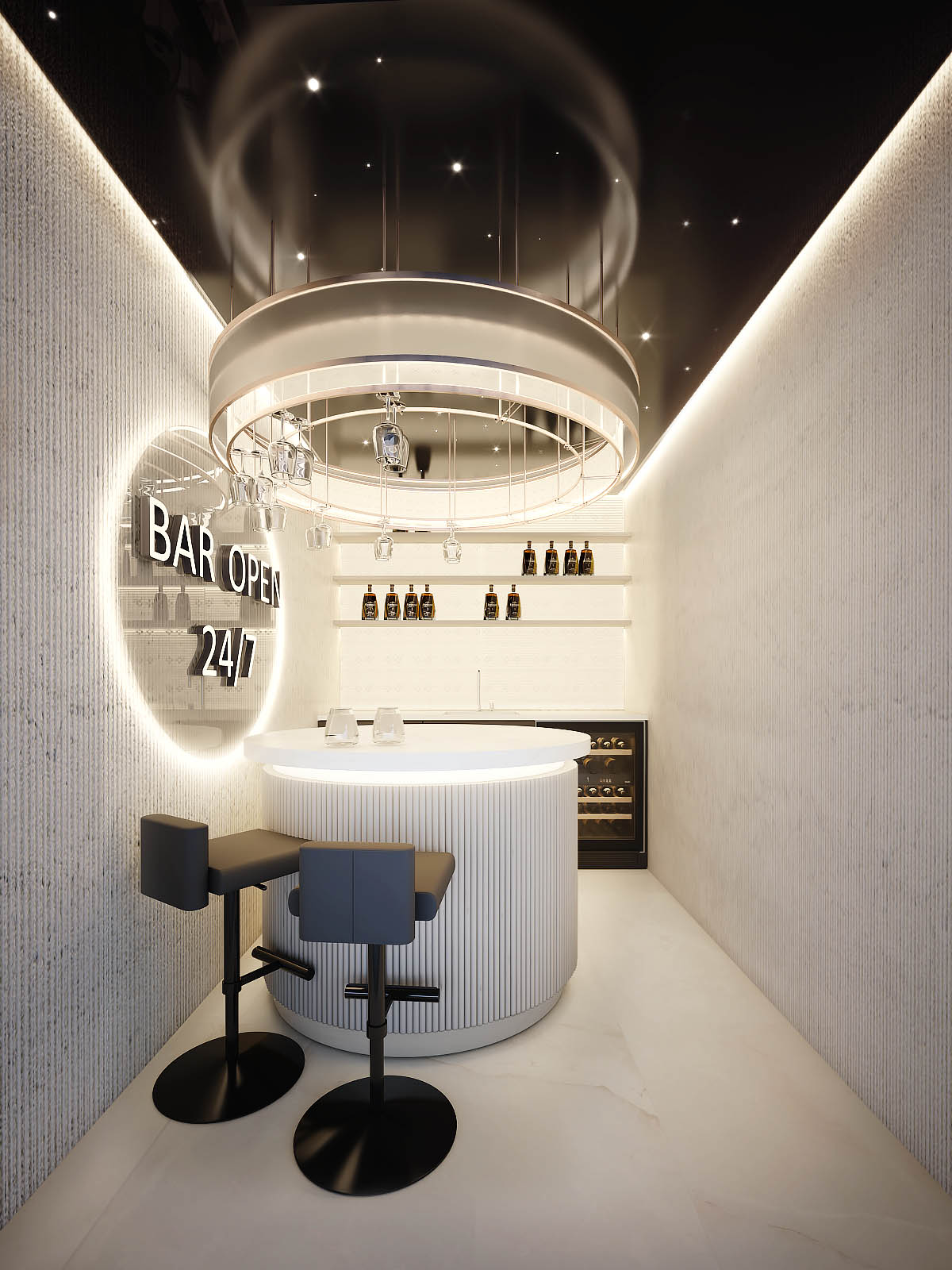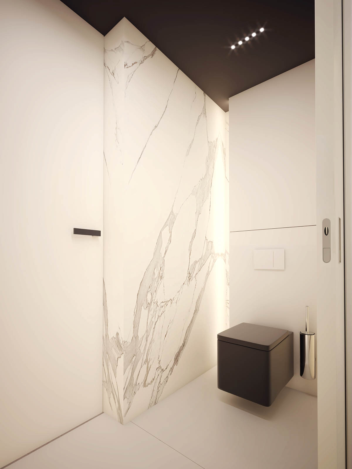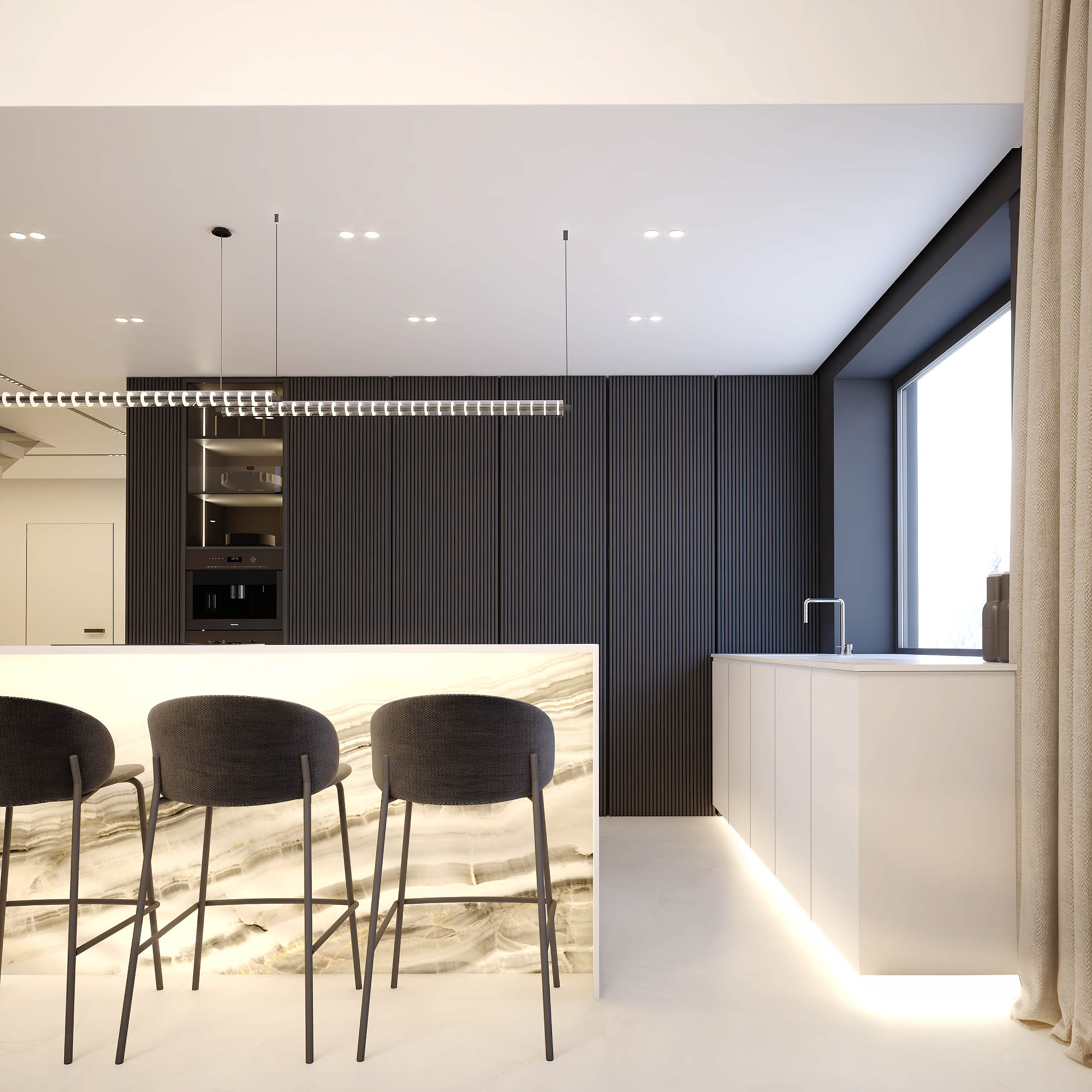 Całość aranżacji balansuje między surowym minimalizmem a wyrafinowanym komfortem, wykorzystując szlachetne materiały – m.in. podświetlony onyks, wielkoformatowe spieki i połyskujące, ciemne płaszczyzny – dla uzyskania efektu głębi i ponadczasowej elegancji.