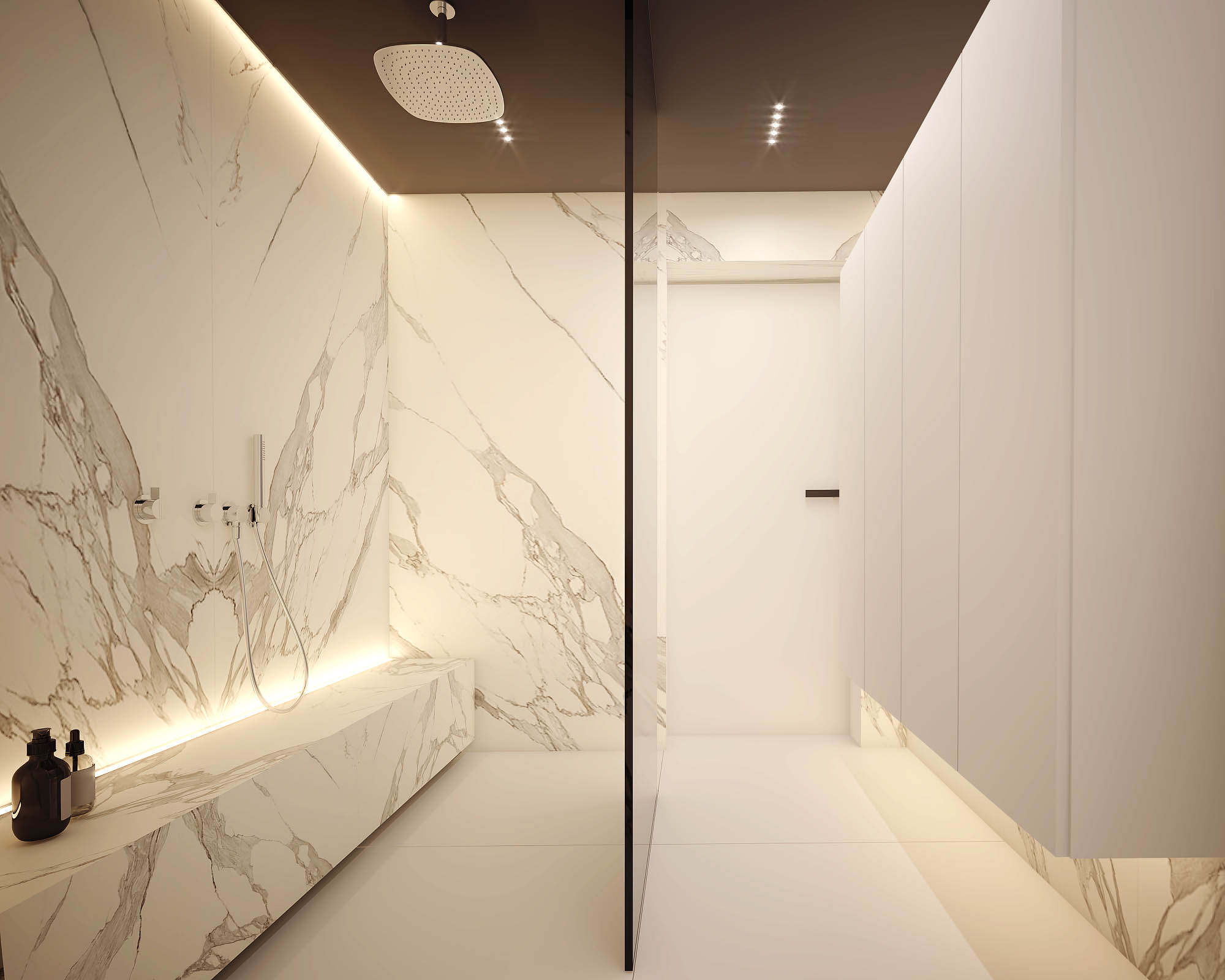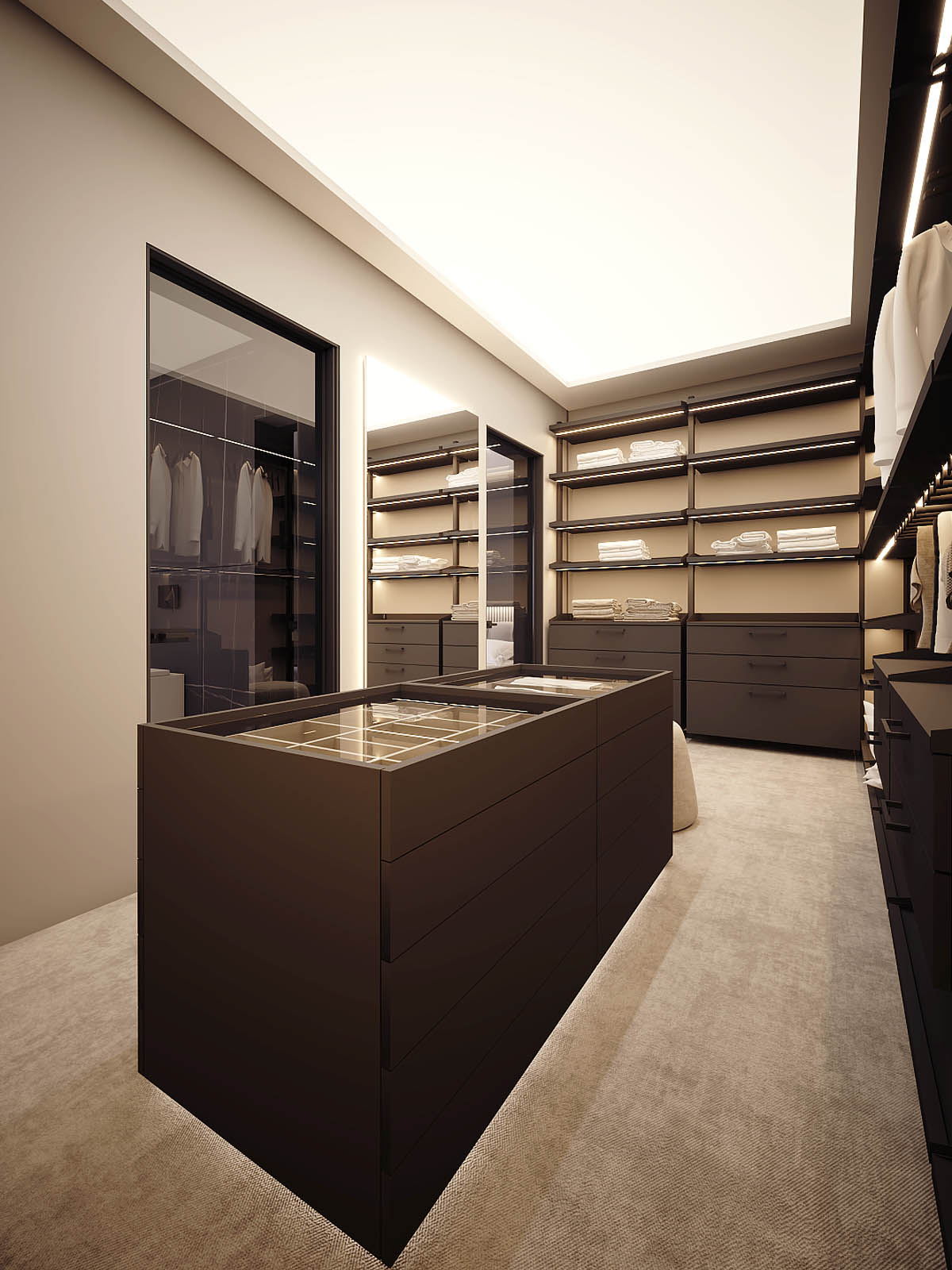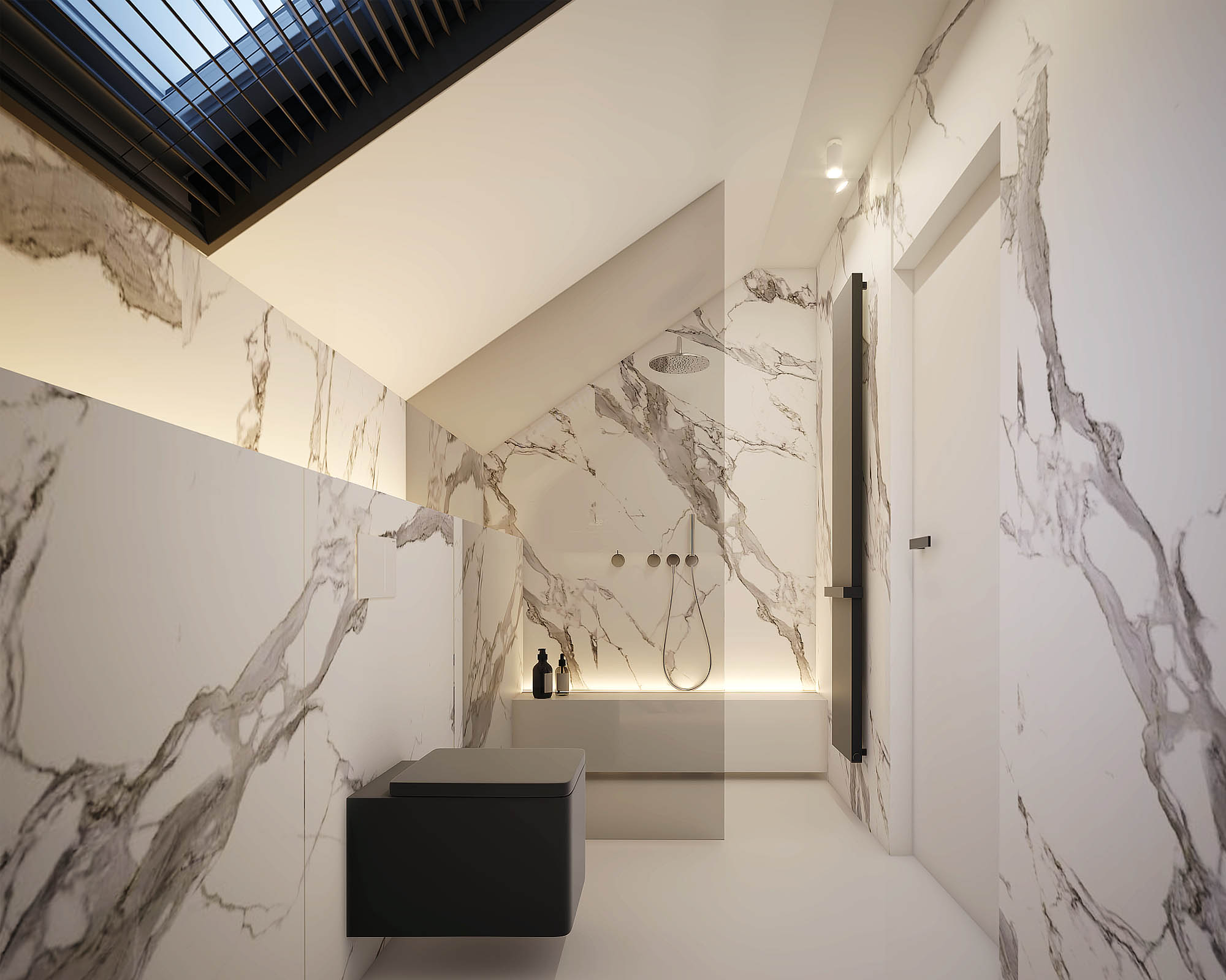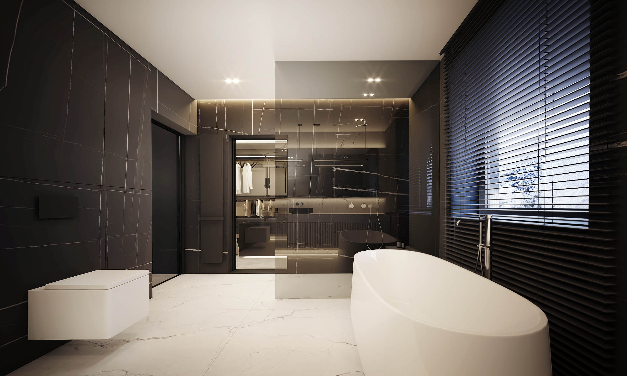 Całość aranżacji balansuje między surowym minimalizmem a wyrafinowanym komfortem, wykorzystując szlachetne materiały – m.in. podświetlony onyks, wielkoformatowe spieki i połyskujące, ciemne płaszczyzny – dla uzyskania efektu głębi i ponadczasowej elegancji.
