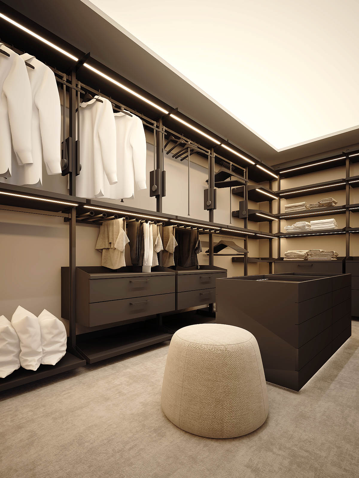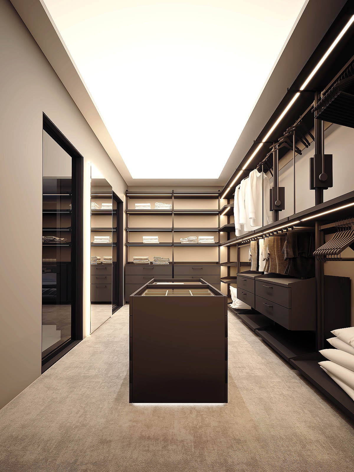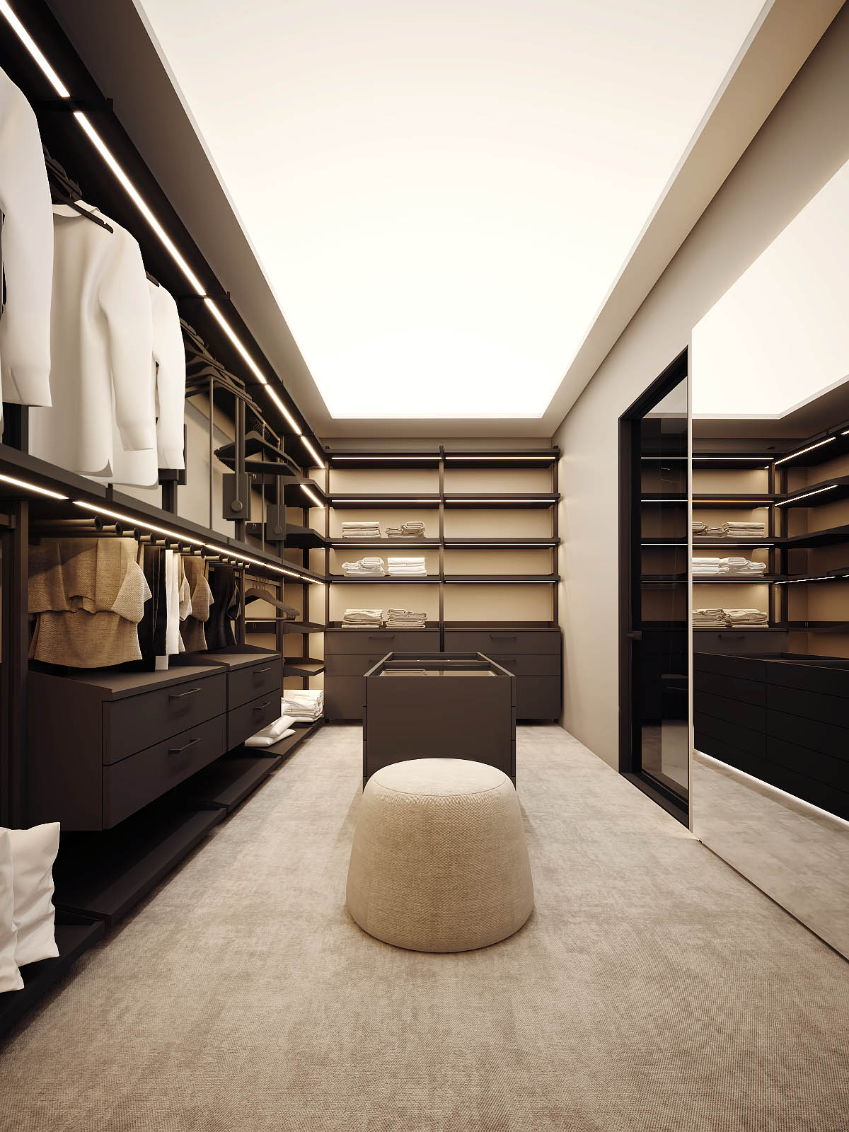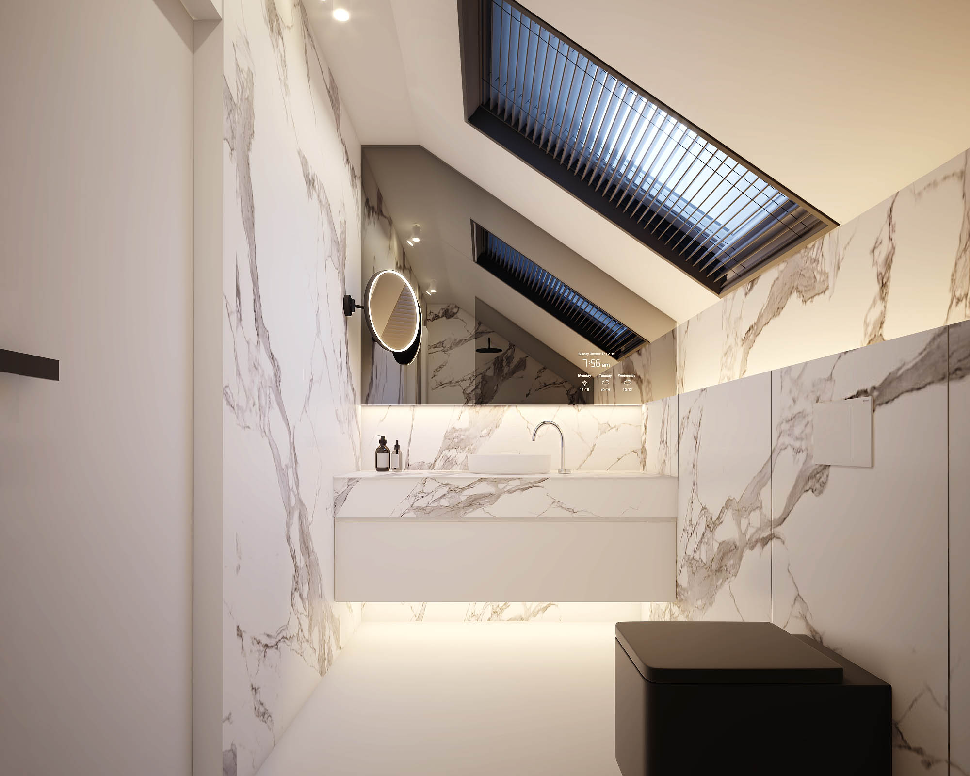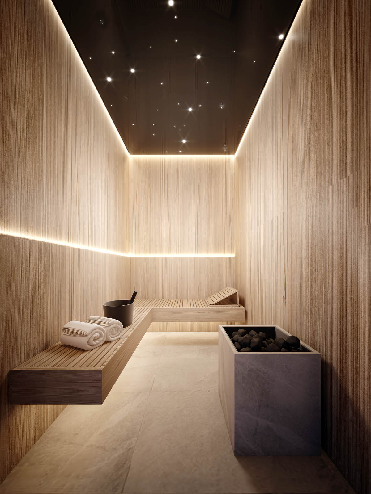 Całość aranżacji balansuje między surowym minimalizmem a wyrafinowanym komfortem, wykorzystując szlachetne materiały – m.in. podświetlony onyks, wielkoformatowe spieki i połyskujące, ciemne płaszczyzny – dla uzyskania efektu głębi i ponadczasowej elegancji.